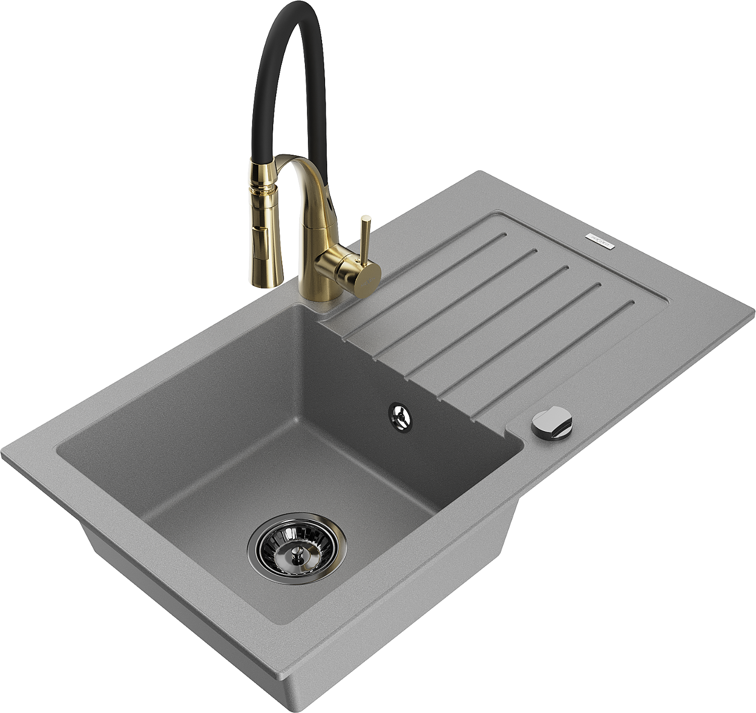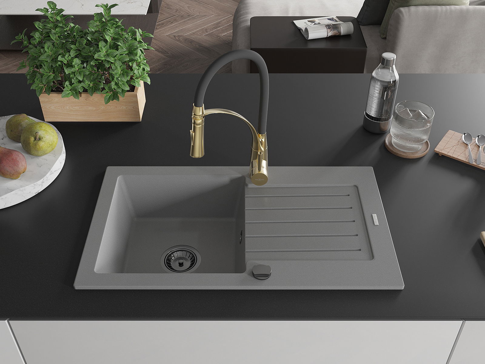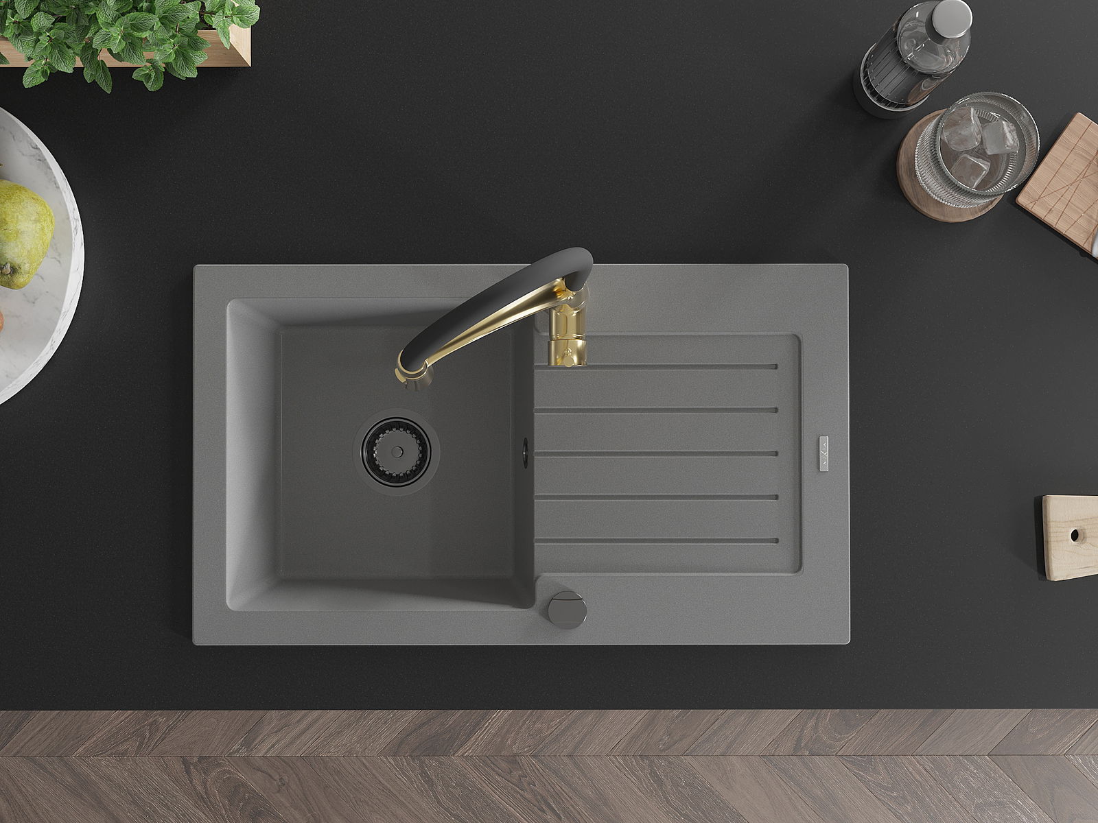 Mexen Pablo chiuvetă din granit cu 1 compartiment cu scurgător și baterie de bucătărie Aster, gri - 6510-71-73450-57-B