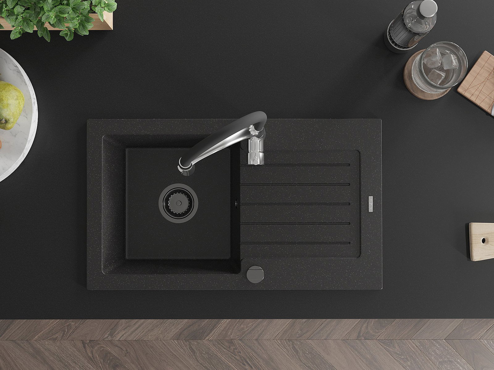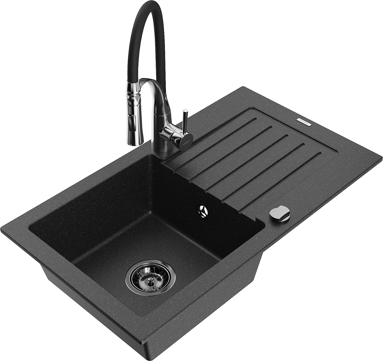 Mexen Pablo chiuvetă de granit cu 1 cuvă, cu scurgător și baterie de bucătărie Aster, negru/argintiu metalic