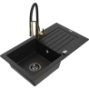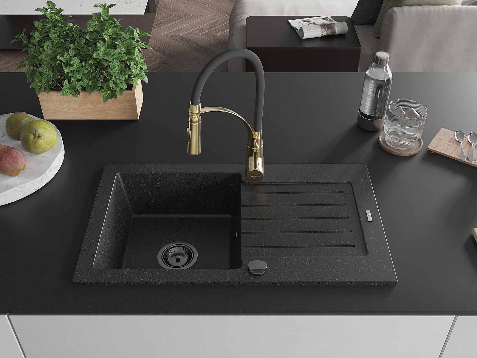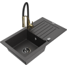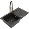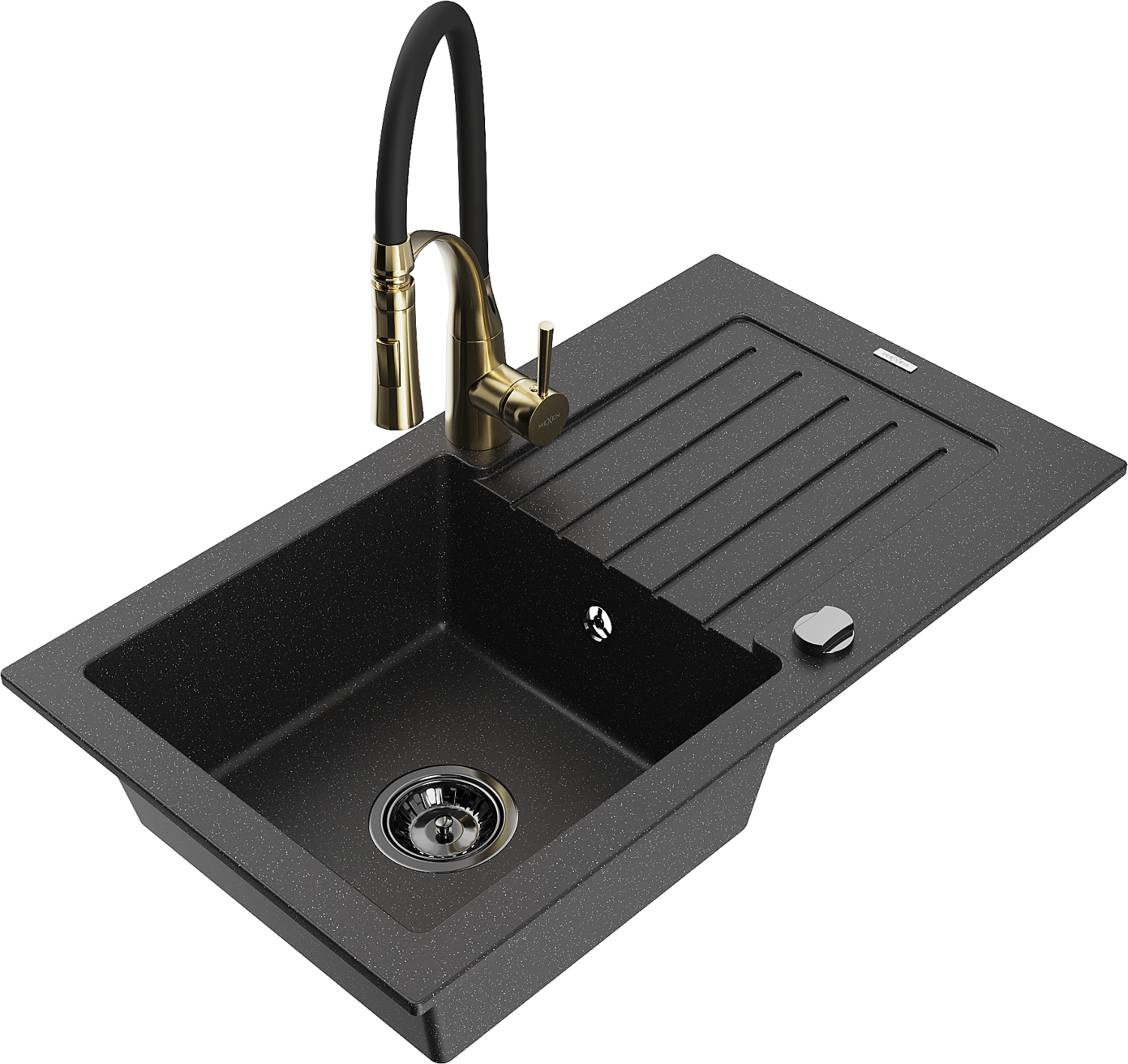 Mexen Pablo chiuvetă granitică cu o singură cuvă, cu picurător și baterie de bucătărie Aster, negru/argintiu metalizat