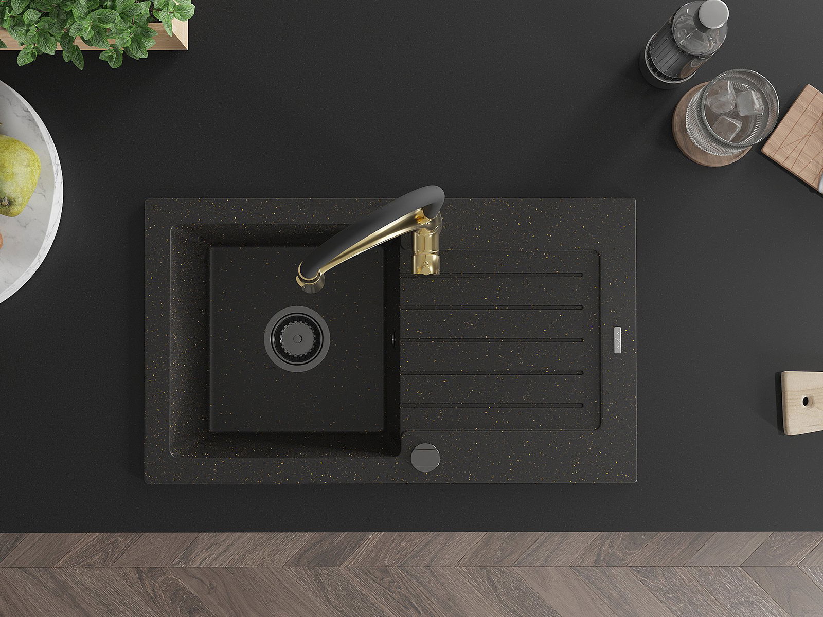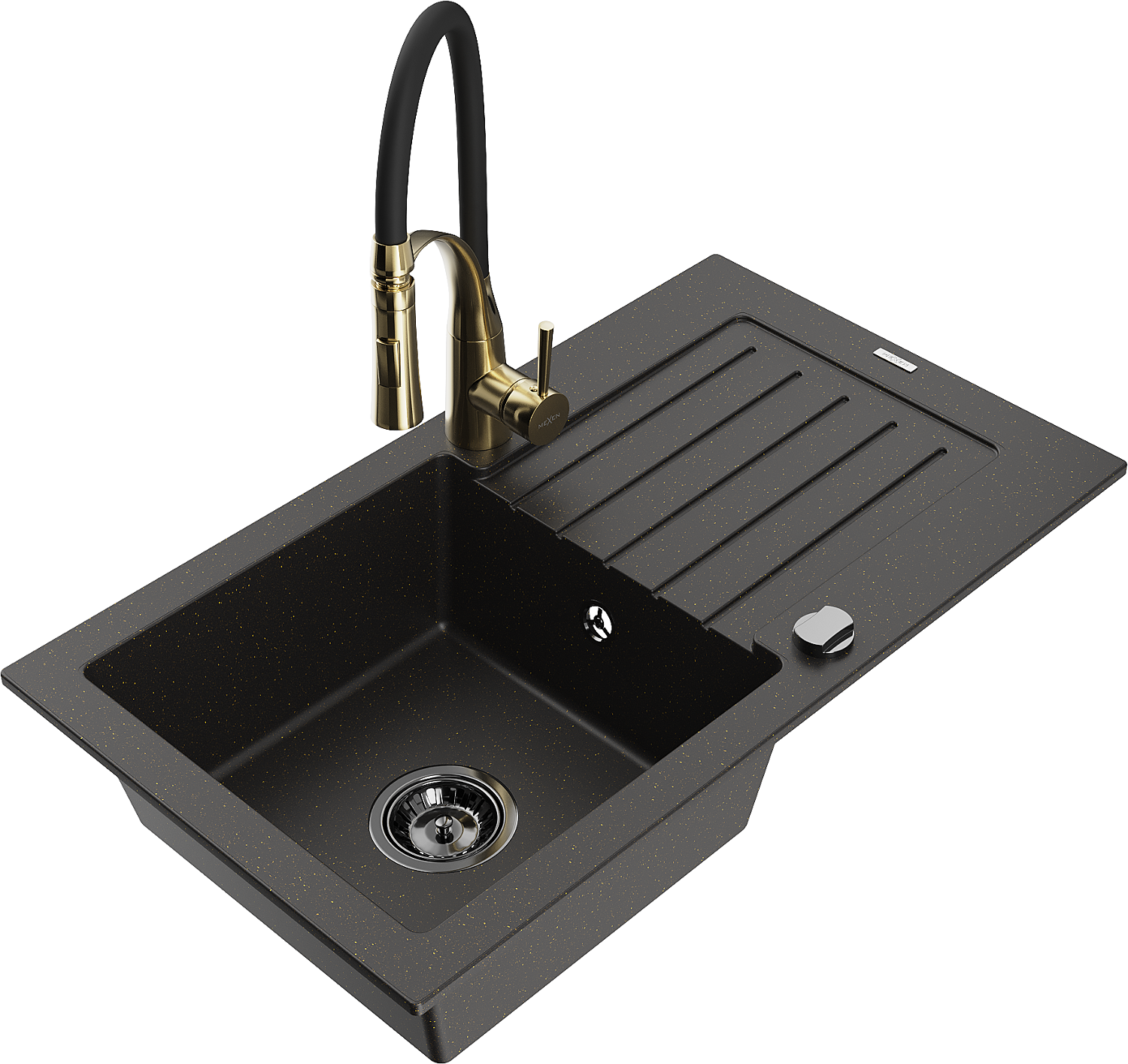 Mexen Pablo chiuvetă din granit cu 1 compartiment cu scurgător și baterie de bucătărie Aster, negru/auriu metalic