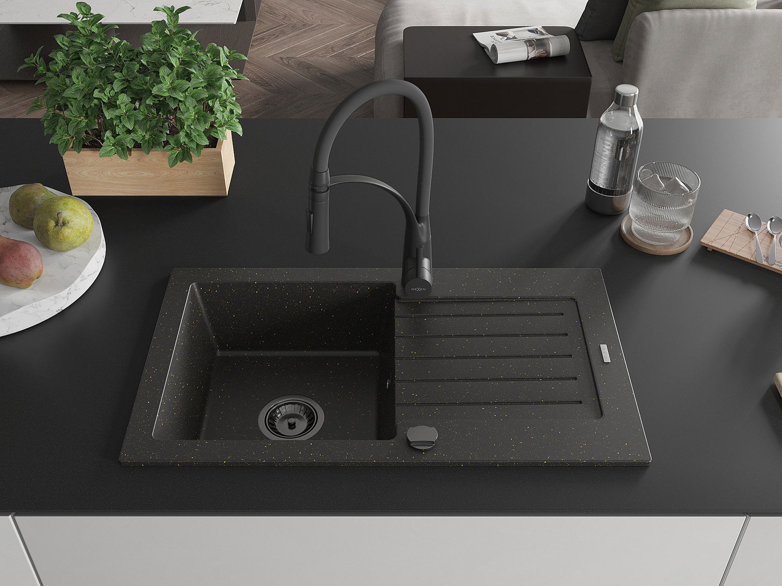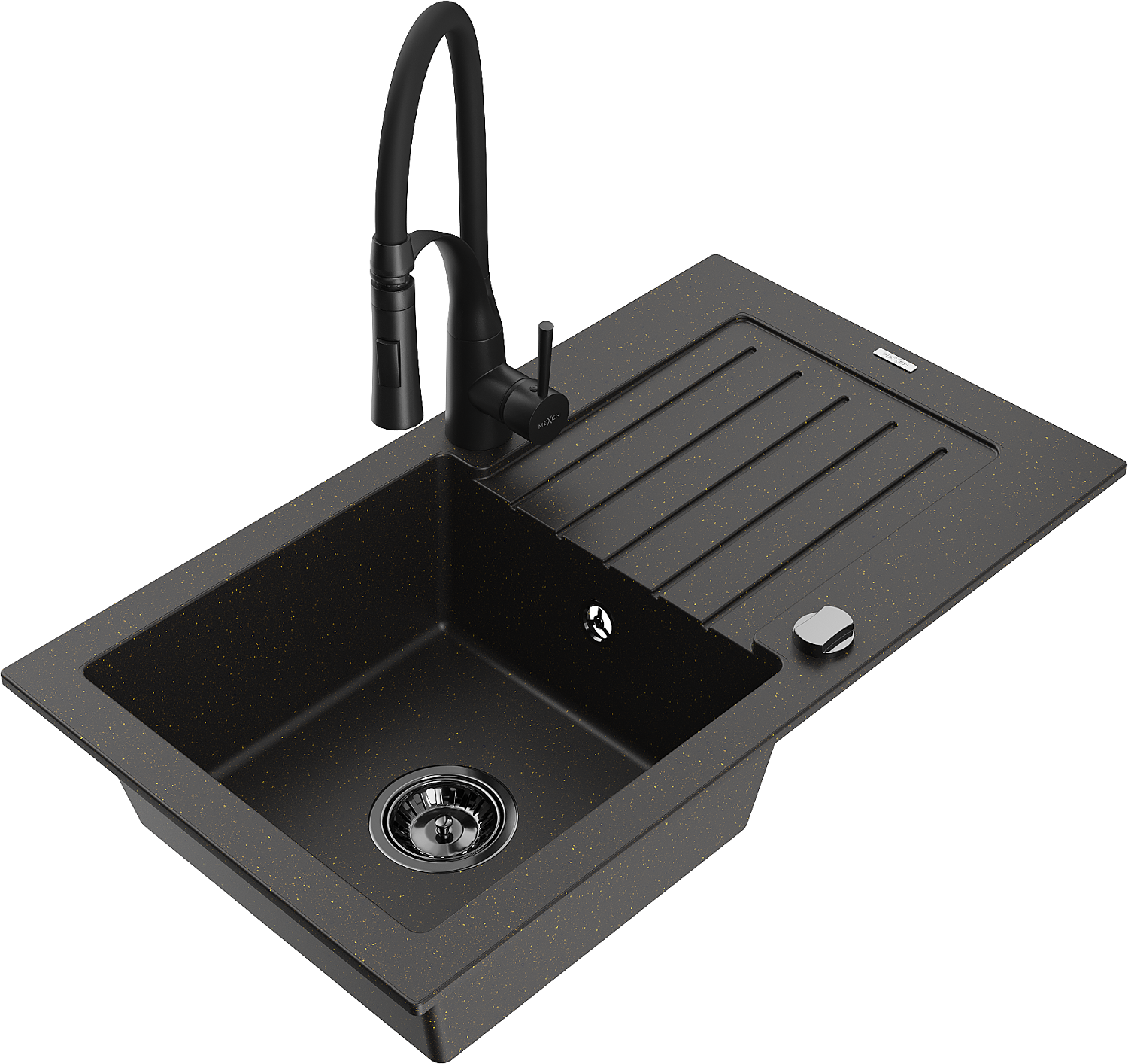 Mexen Pablo chiuvetă de granit cu 1 compartiment cu scurgător și baterie de bucătărie Aster, negru/auriu metalizat