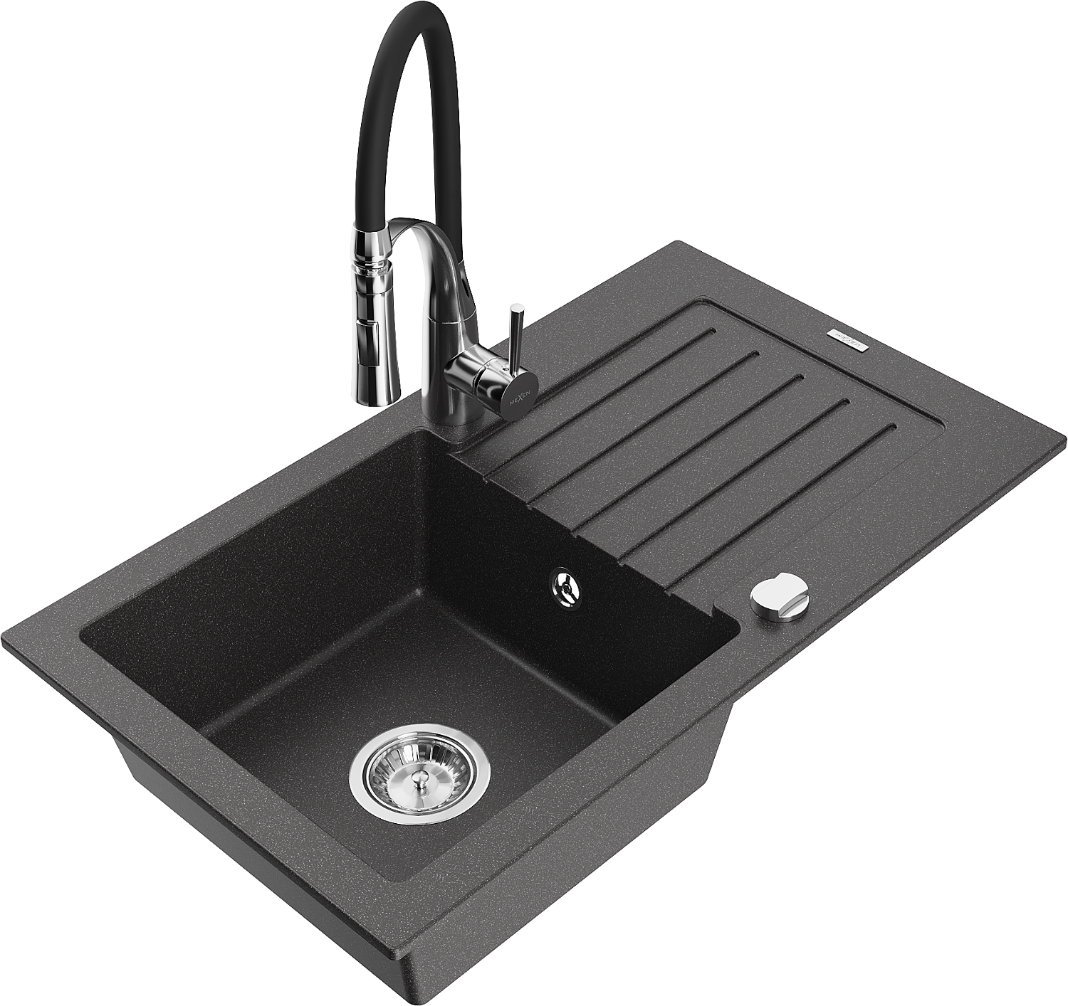 Mexen Pablo chiuvetă de granit cu o cuvă, cu scurgător și baterie de bucătărie Aster, negru cu pete - 6510-76-73450-07