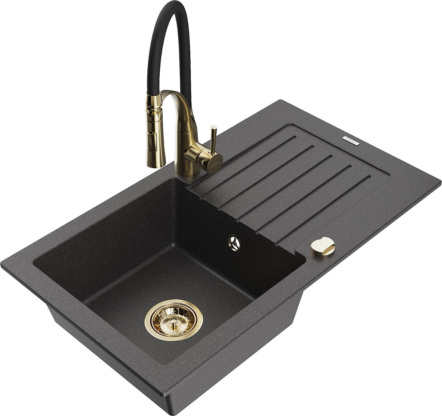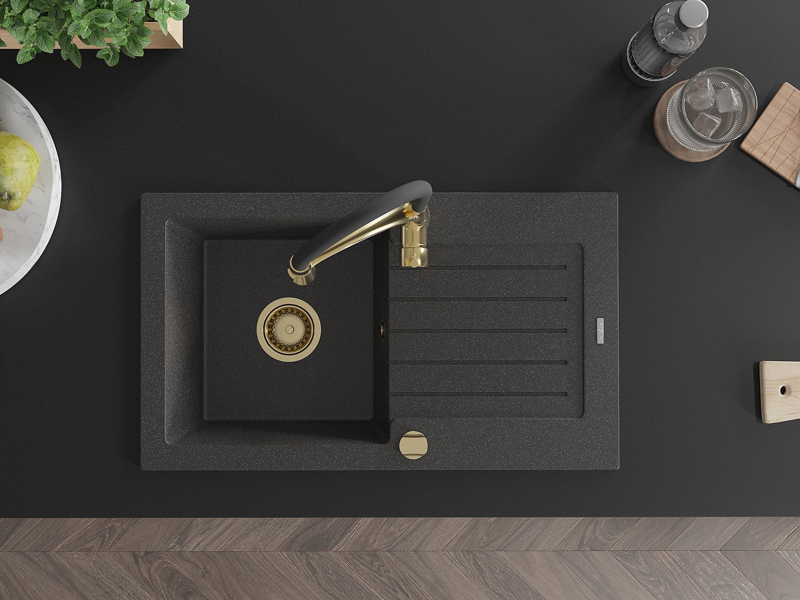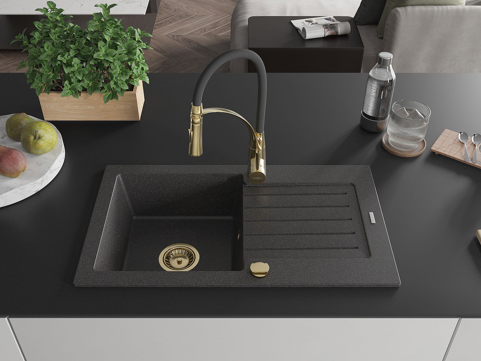 Mexen Pablo chiuvetă de granit cu o cuvă cu scurgător și baterie de bucătărie Aster, negru cu pete - 6510-76-73450-57-G