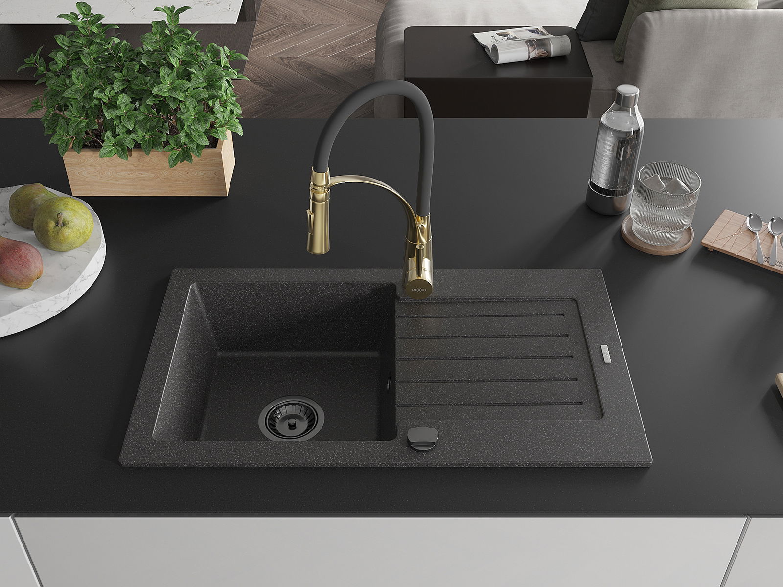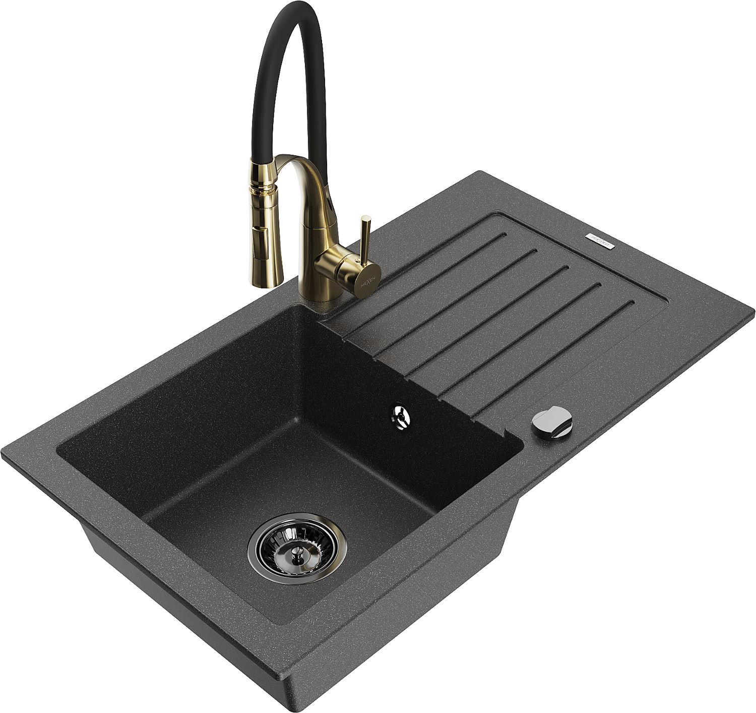 Mexen Pablo chiuvetă de granit cu 1 cameră cu scurgător și baterie de bucătărie Aster, negru cu pete - 6510-76-73450-57-B