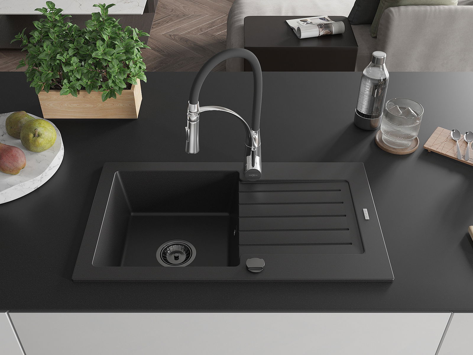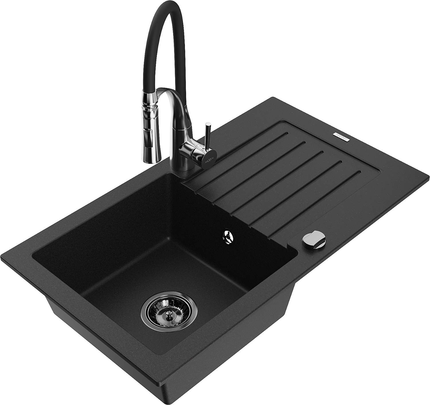 Mexen Pablo chiuvetă de granit cu 1 compartiment, cu scurgător și baterie de bucătărie Aster, negru - 6510-77-73450-07-B