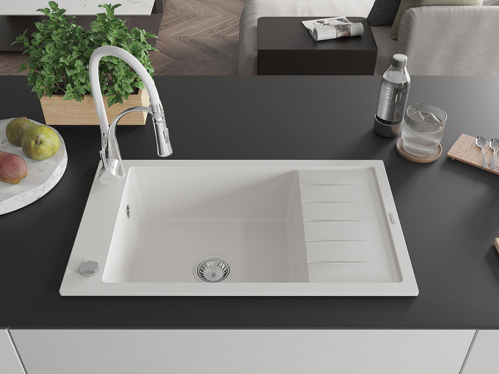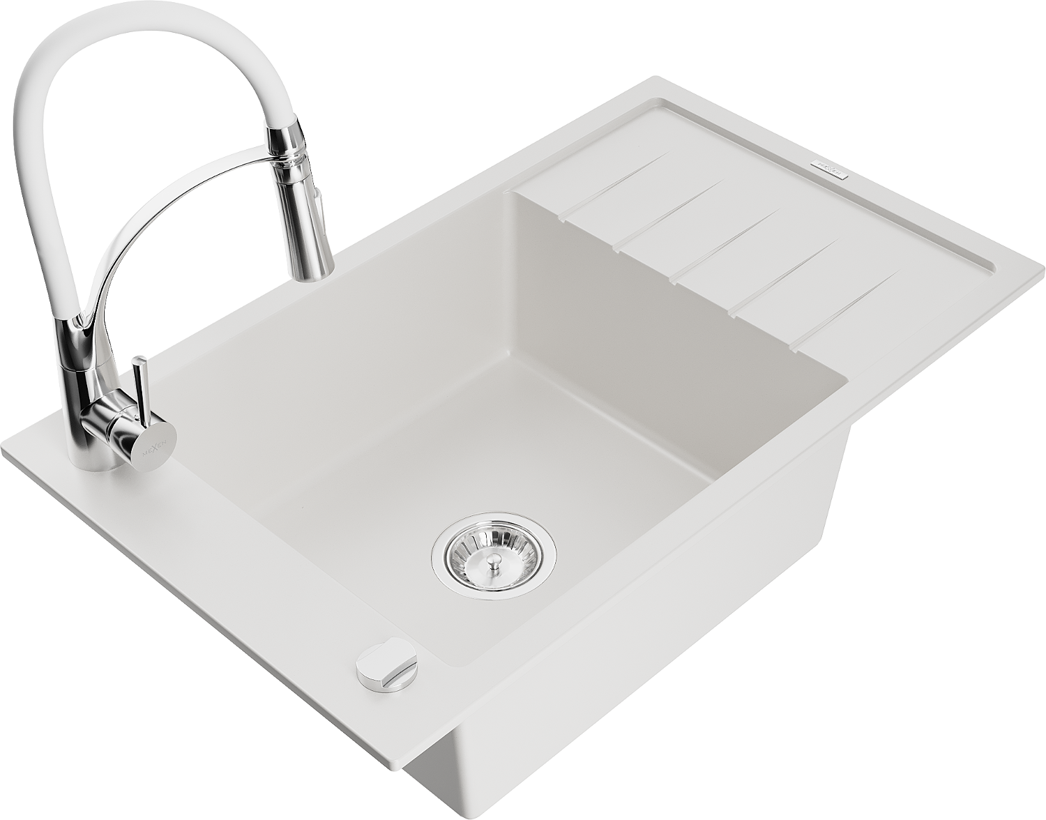 Mexen Elias chiuvetă de bucătărie din granit cu 1 cuvă și picurător și baterie de bucătărie Aster, alb - 6511-20-73450-02