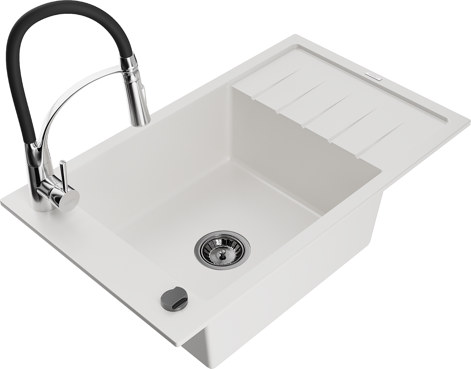 Mexen Elias chiuvetă de granit cu 1 compartiment, cu scurgător și baterie de bucătărie Aster, alb - 6511-20-73450-07-B