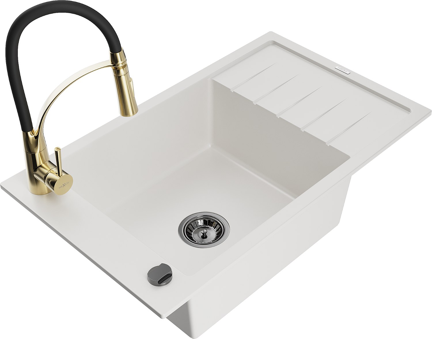 Mexen Elias chiuvetă din granit cu 1 compartiment și scurgător și baterie de bucătărie Aster, alb - 6511-20-73450-57-B
