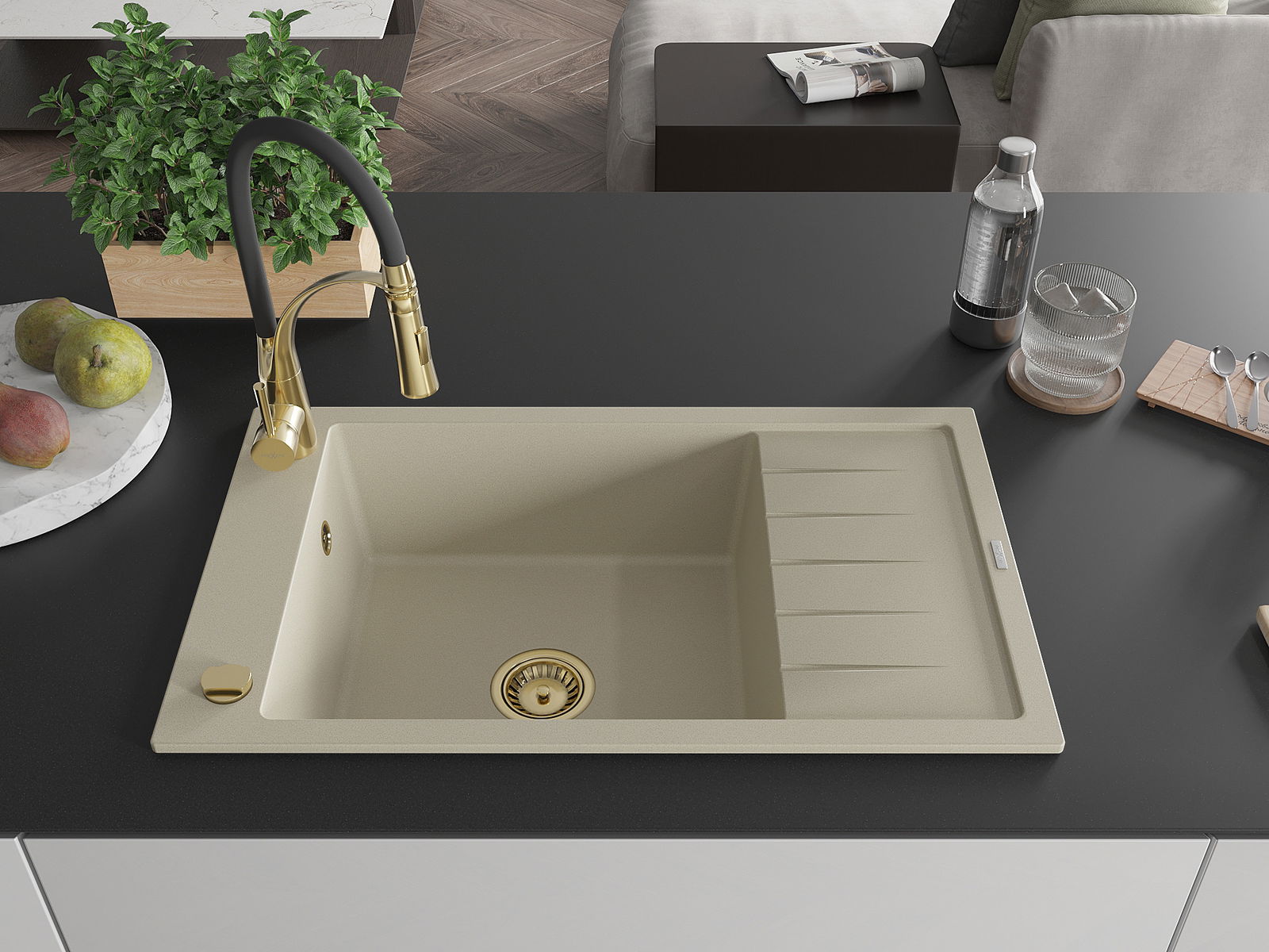 Mexen Elias chiuvetă de granit cu o cuvă, cu scurgător și baterie de bucătărie Aster, bej - 6511-69-73450-57-G