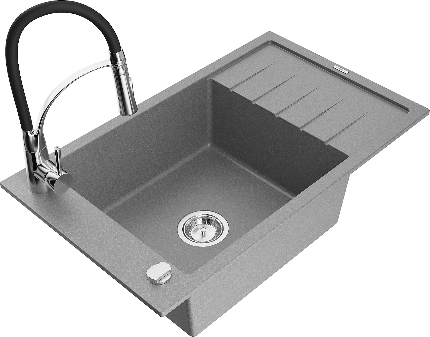 Mexen Elias chiuvetă de granit cu 1 compartiment cu scurgător și baterie de bucătărie Aster, gri - 6511-71-73450-07