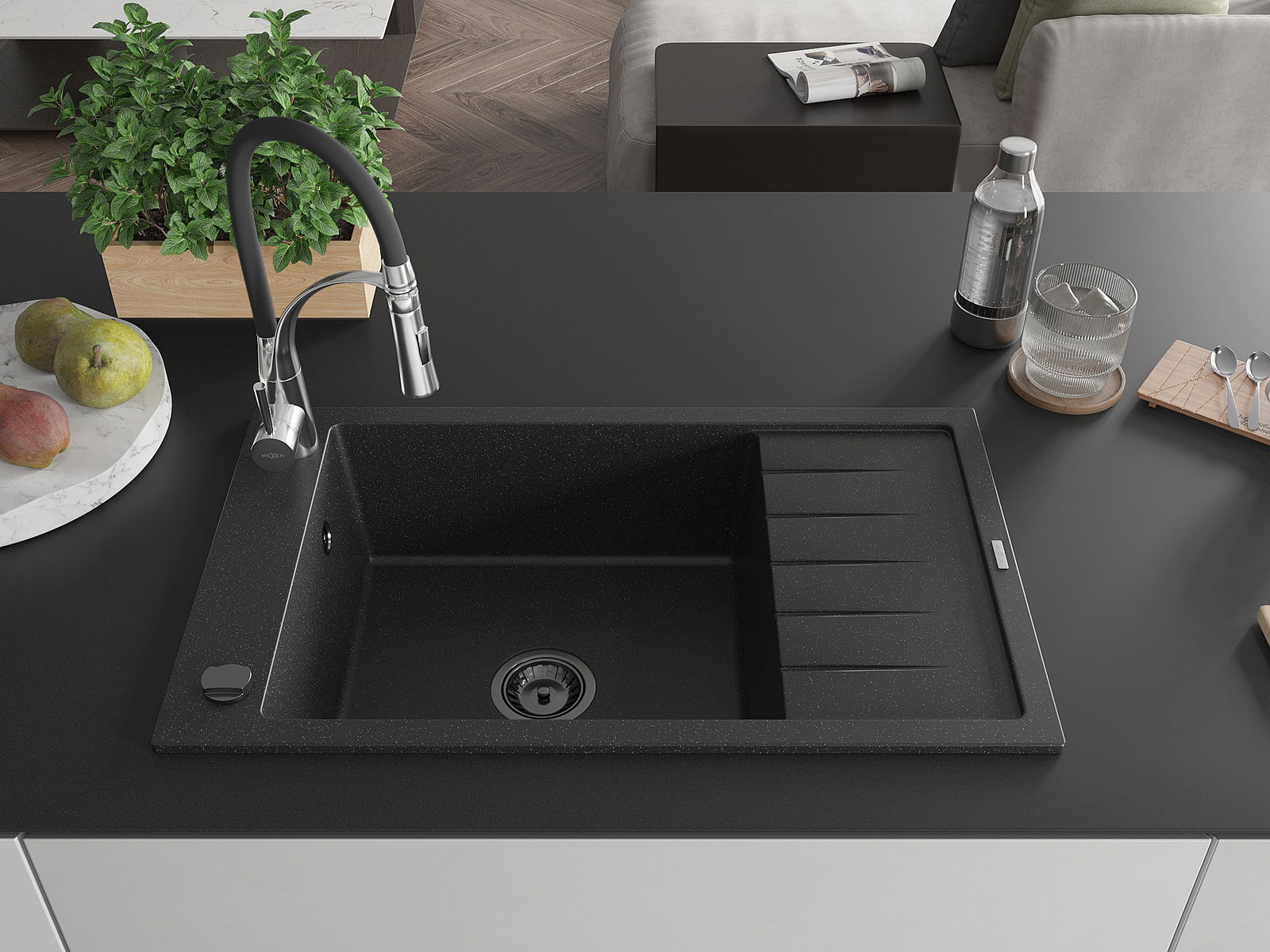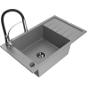 Mexen Elias chiuvetă de granit cu 1 compartiment cu scurgător și baterie de bucătărie Aster, negru/argintiu metalizat