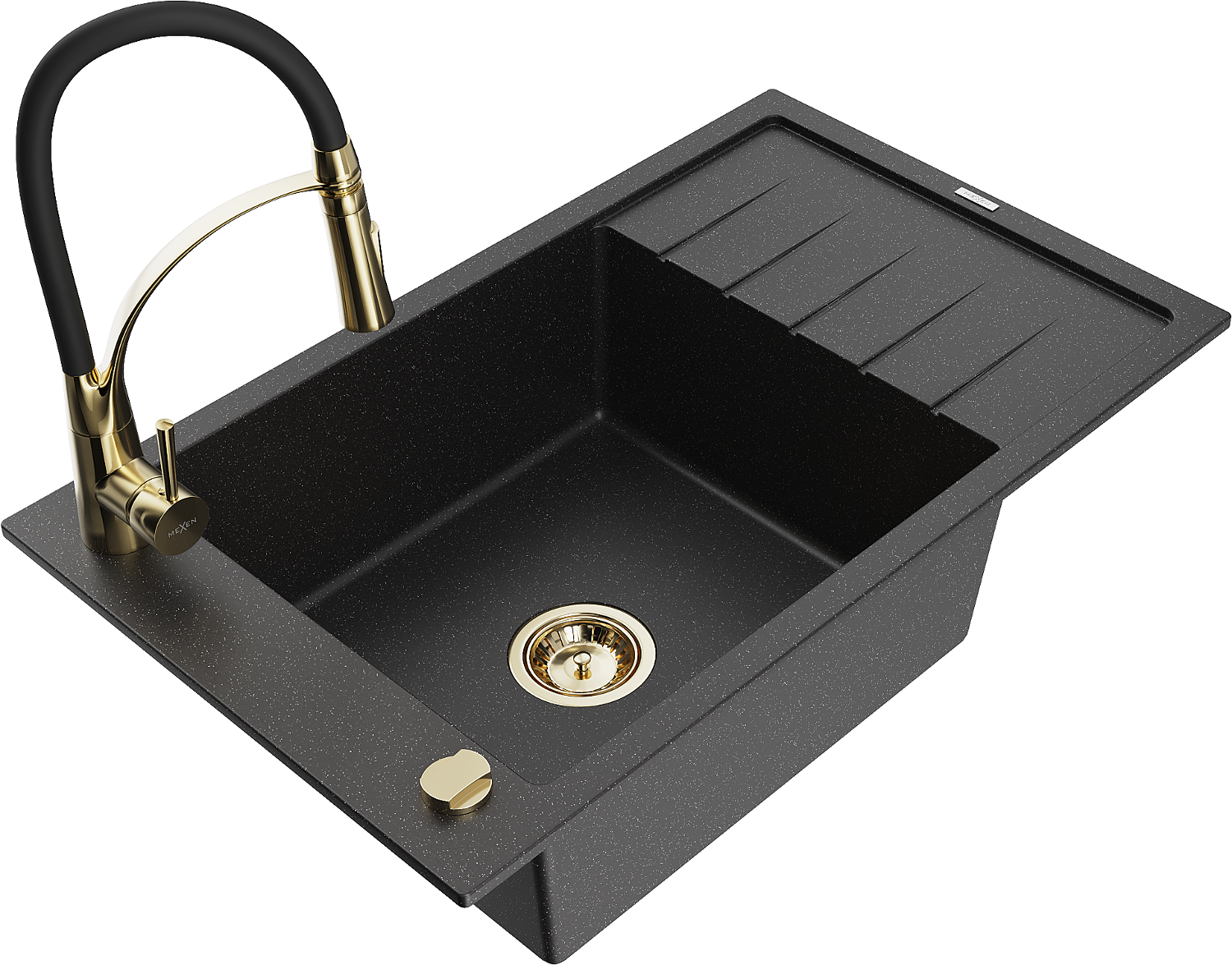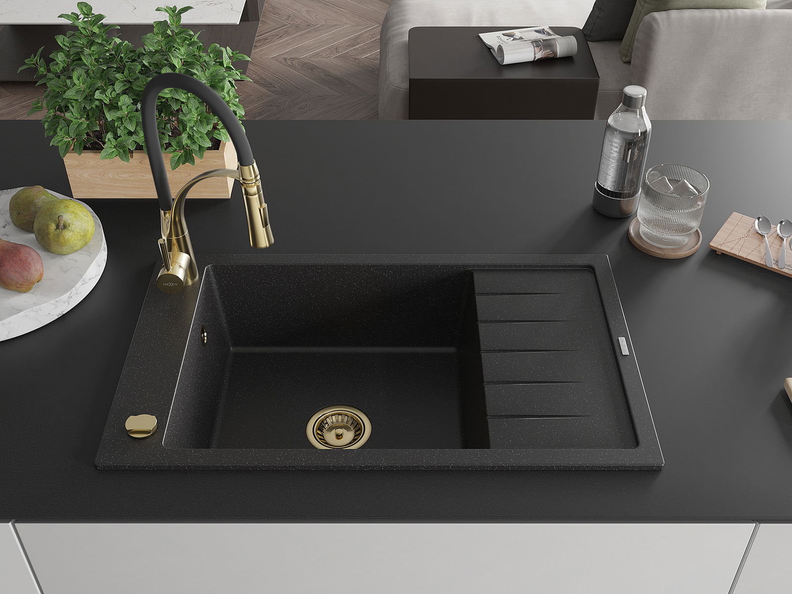 Mexen Elias chiuvetă de granit cu 1 cameră cu scurgător și baterie de bucătărie Aster, negru/argintiu metalic