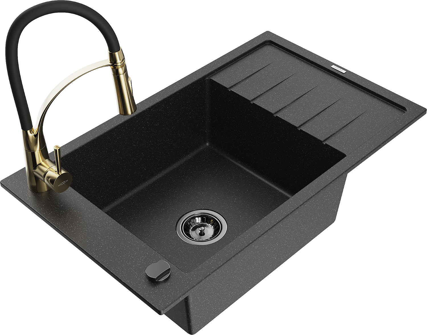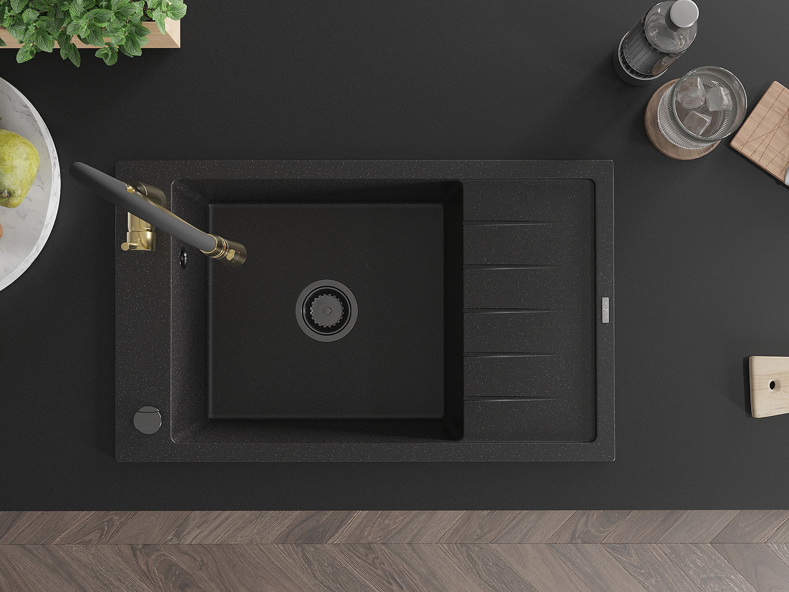 Mexen Elias chiuvetă de bucătărie din granit cu 1 cuvă, cu scurgător și baterie Aster, negru/argintiu metalic