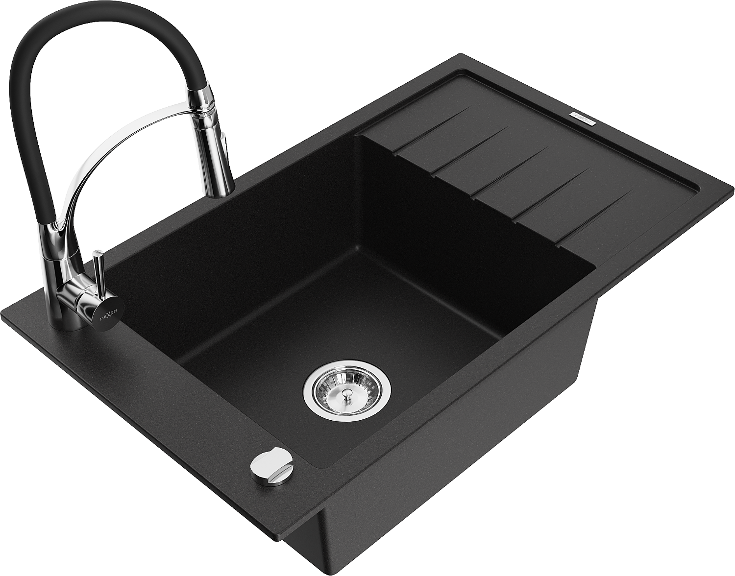 Mexen Elias chiuvetă de bucătărie din granit cu 1 compartiment, cu scurgător și baterie Aster, negru - 6511-77-73450-07