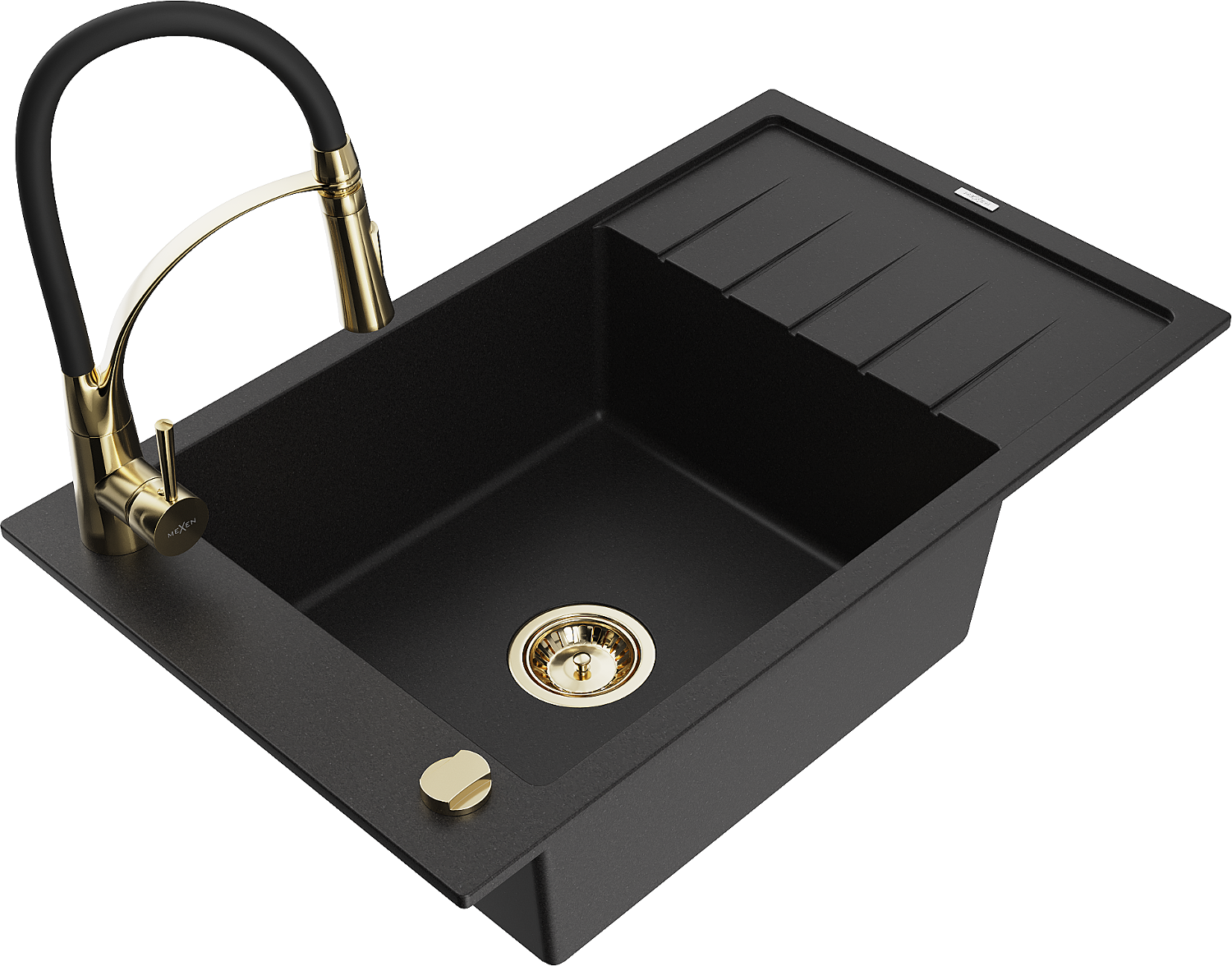 Mexen Elias chiuvetă din granit cu 1 compartiment cu scurgător și baterie de bucătărie Aster, negru - 6511-77-73450-57-G
