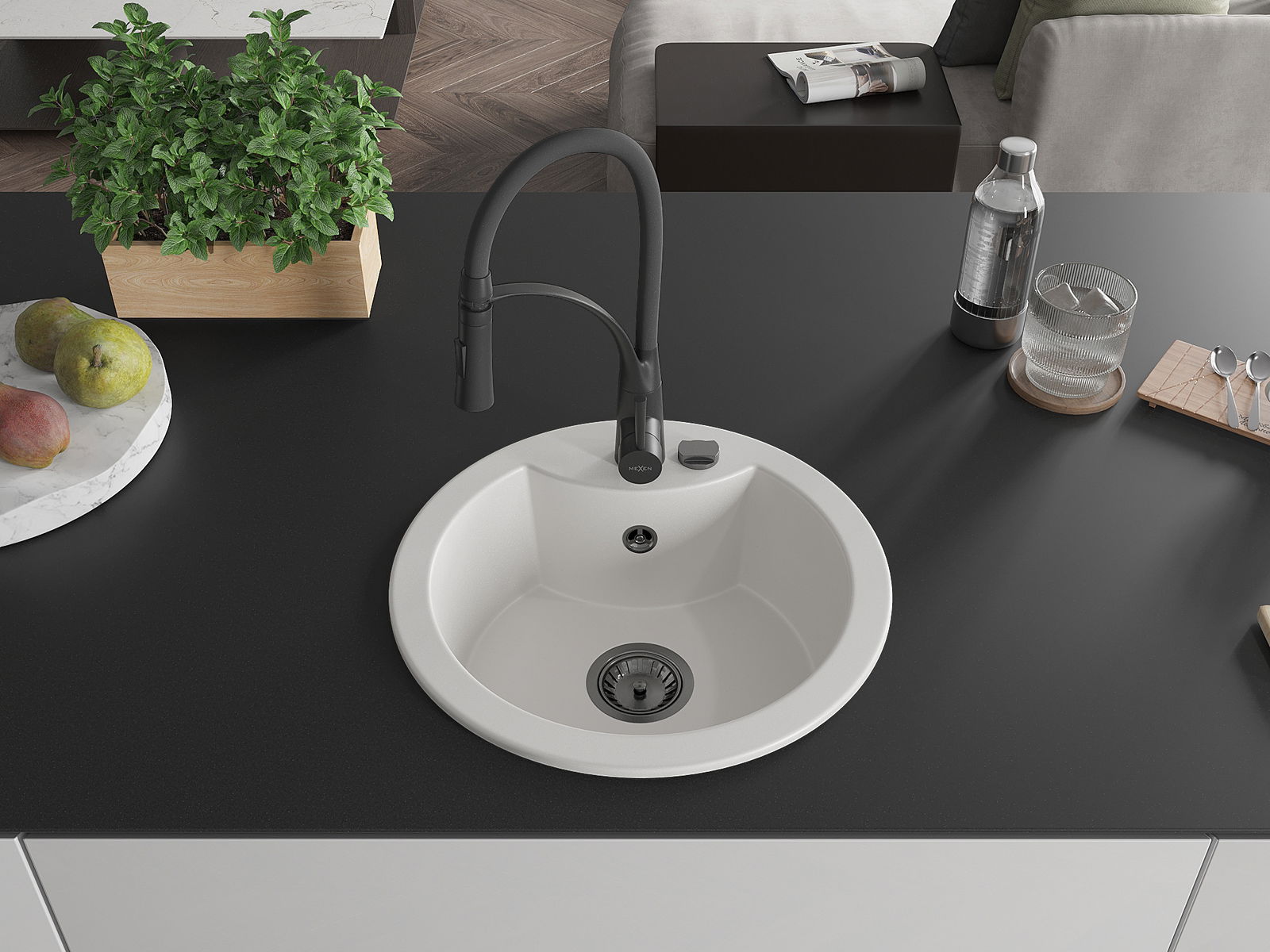 Suprafața chiuvetei este rezistentă la pete și decolorarea, datorită căreia este ușor de curățat și își păstrează culoarea mult timp. Estetică și practic completarea fiecărei bucătării.