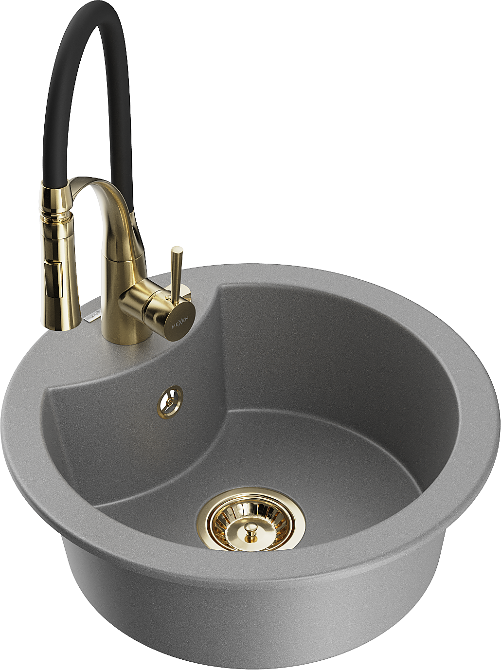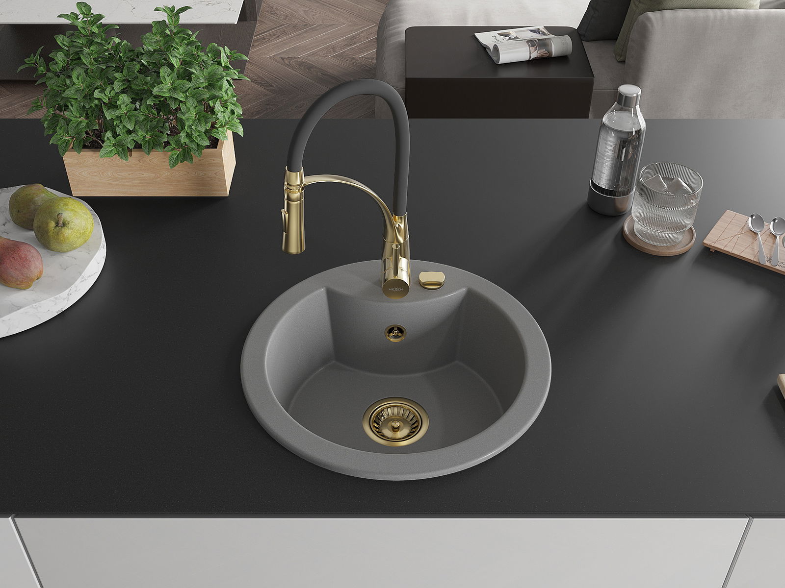 Mexen Diego chiuvetă de bucătărie din granit cu 1 compartiment și baterie de bucătărie Aster, gri - 6512-71-73450-57-G