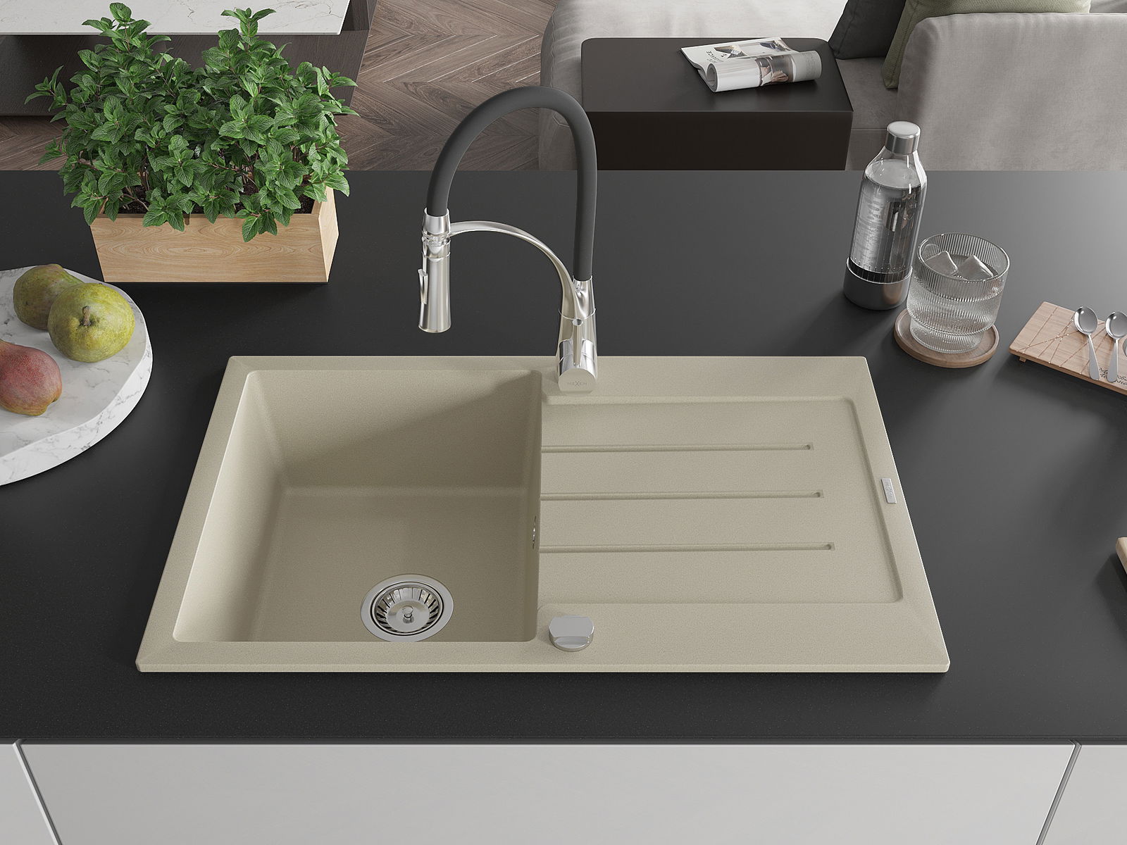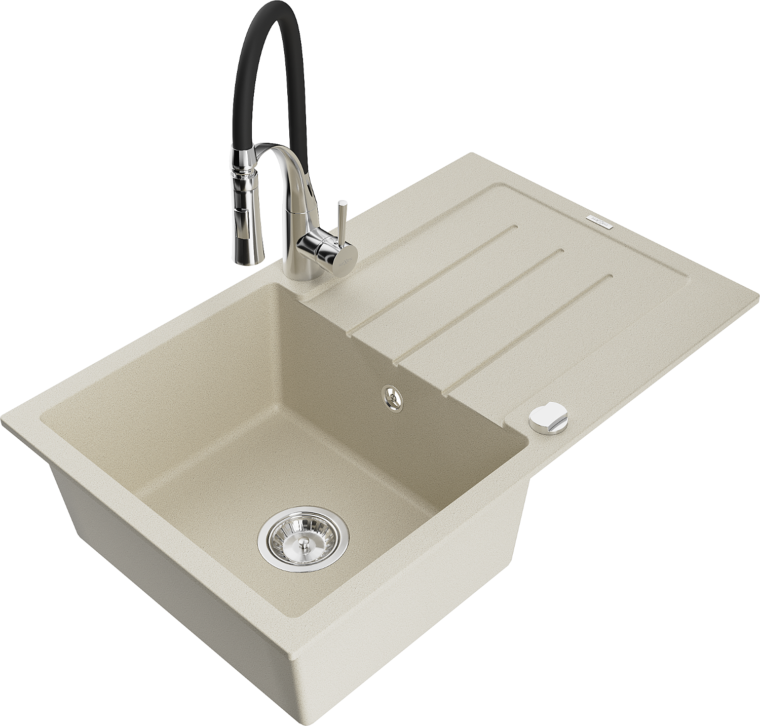Mexen Bruno chiuvetă de granit cu 1 cuvă și scurgător și baterie de bucătărie Aster, bej - 6513-69-73450-07