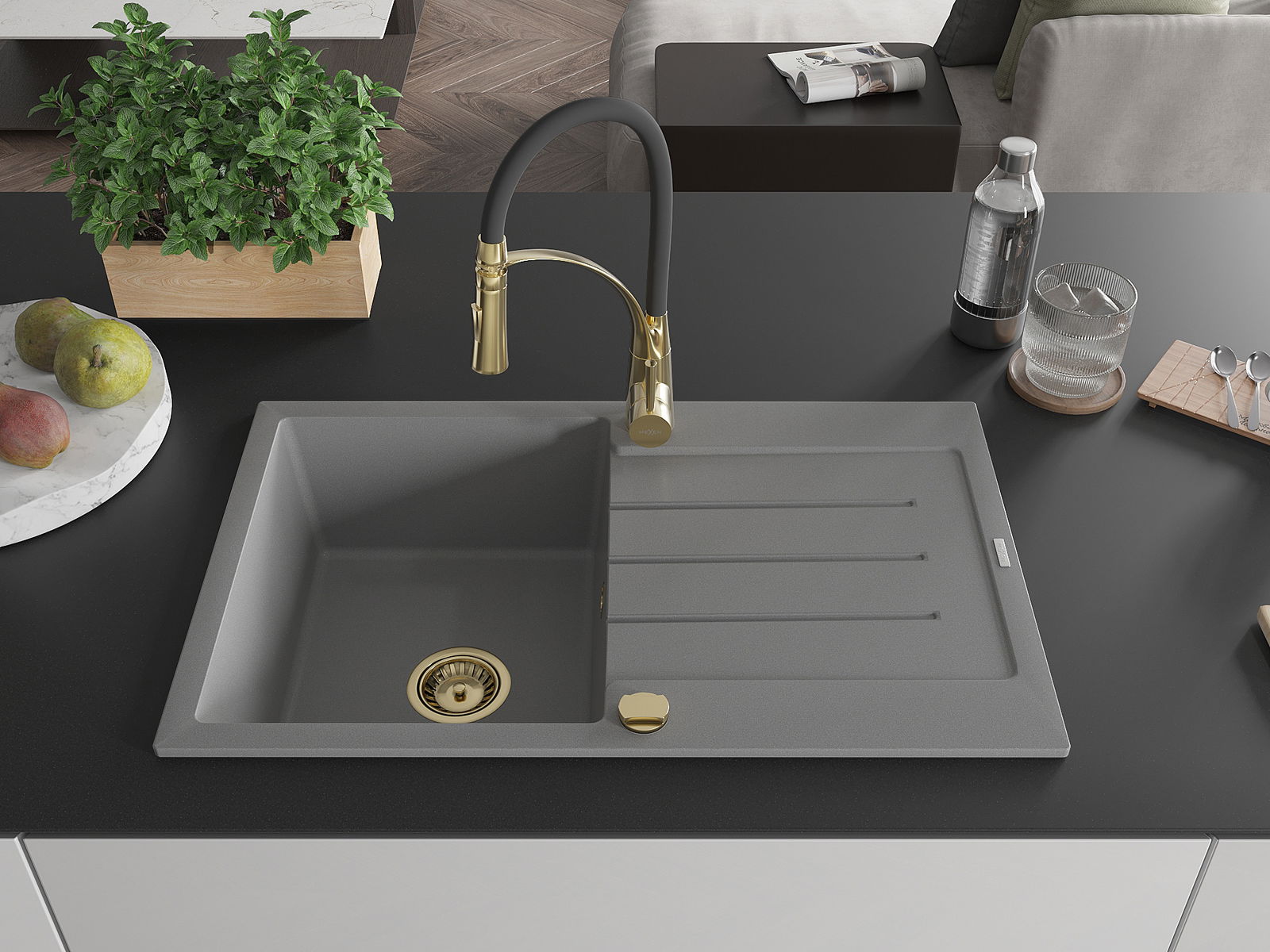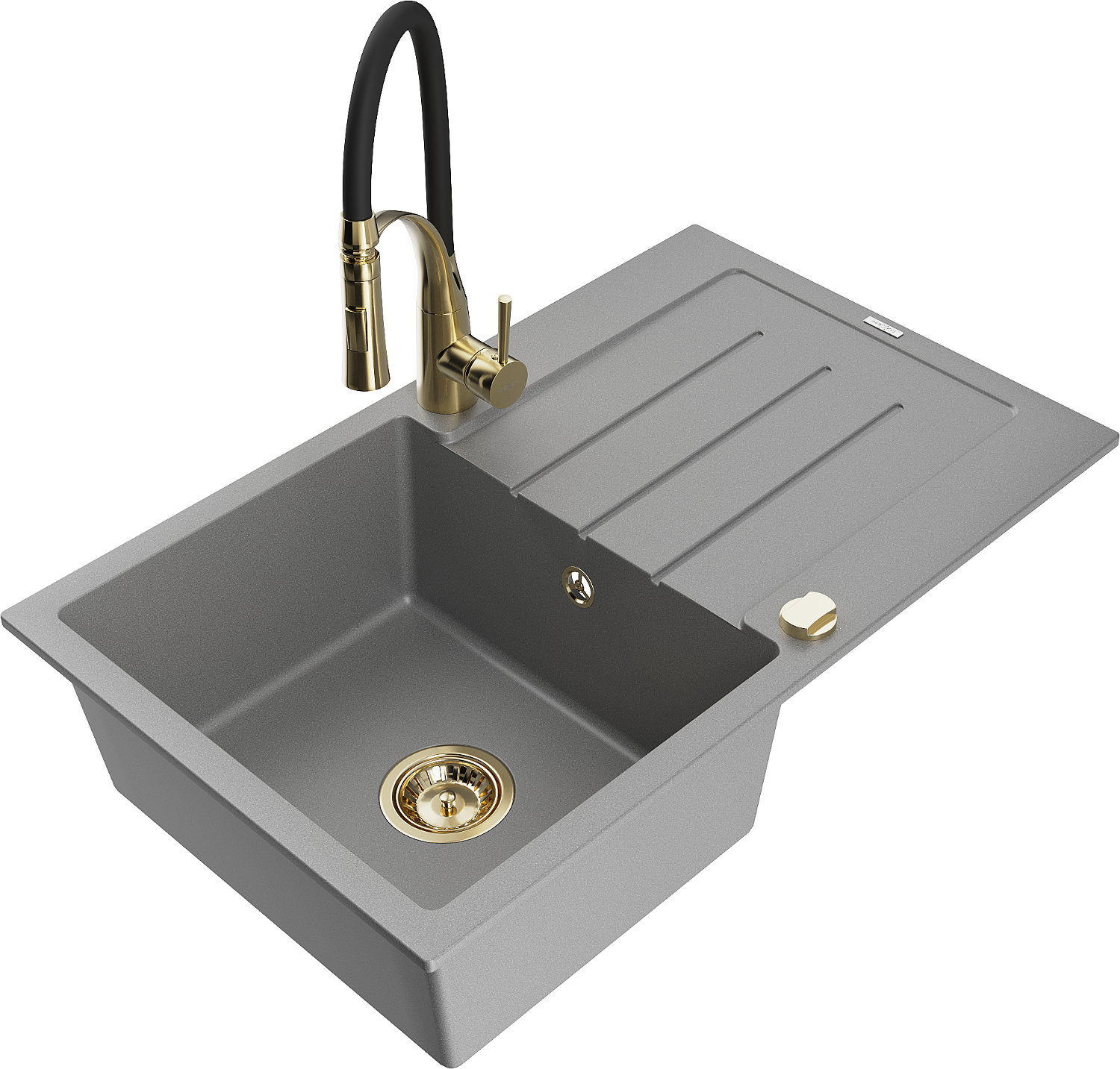 Mexen Bruno chiuveta de granit cu 1 compartiment cu scurgător și baterie de bucătărie Aster, gri - 6513-71-73450-57-G