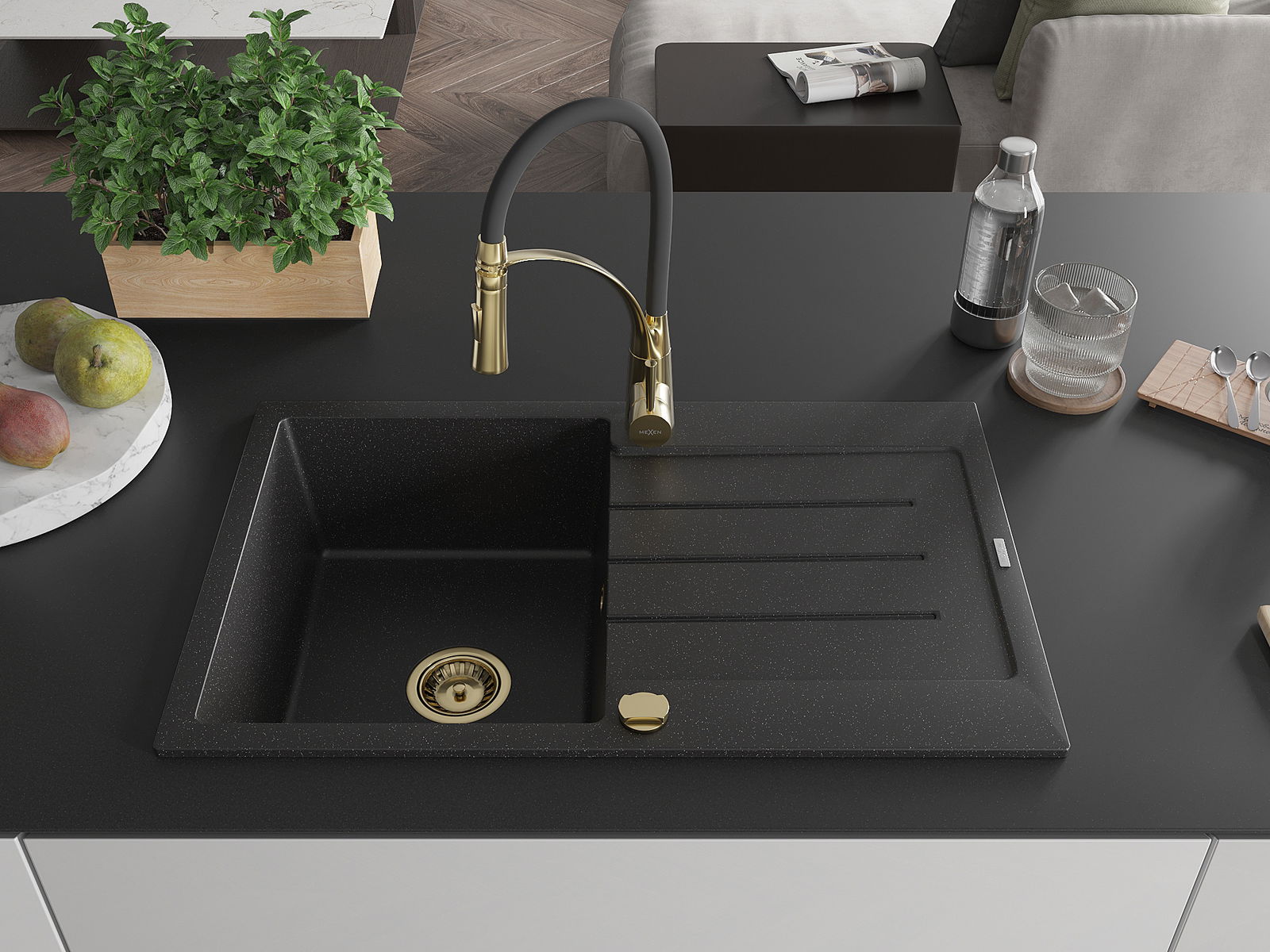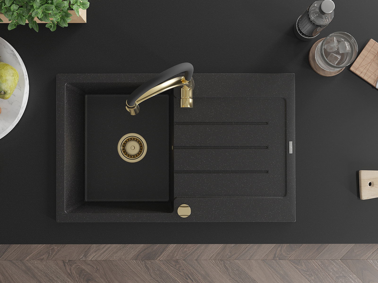 Mexen Bruno chiuvetă de granit cu o cuvă și scurgător, cu baterie de bucătărie Aster, negru/argintiu metalizat