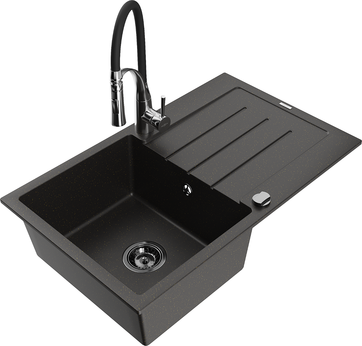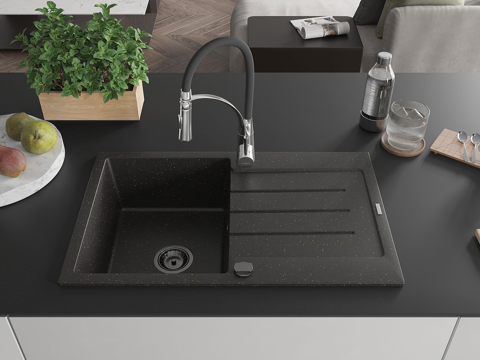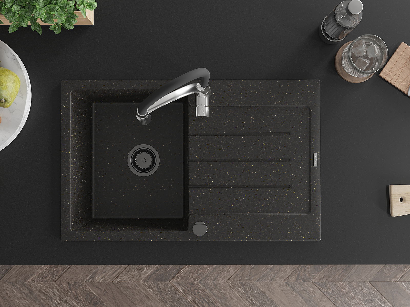 Mexen Bruno chiuvetă din granit cu 1 compartiment cu scurgător și baterie de bucătărie Aster, negru/auriu metalic