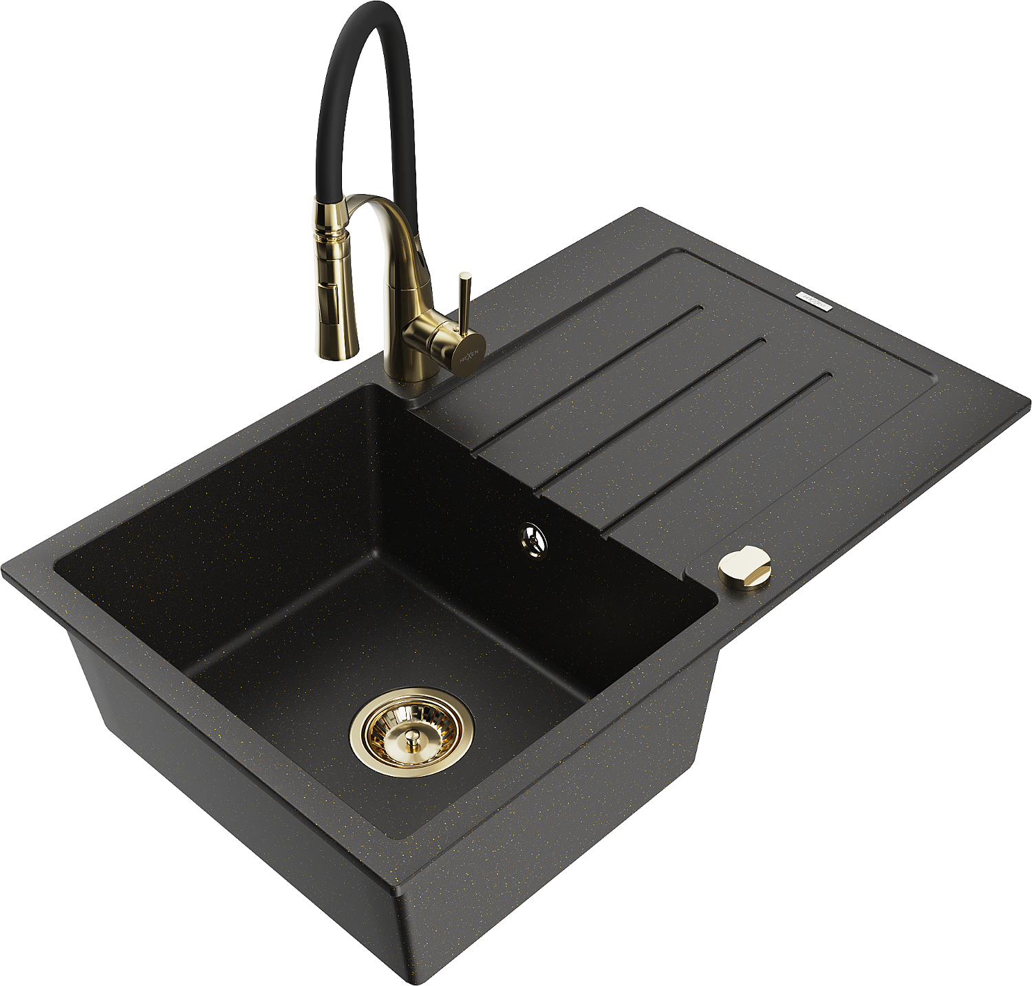 Mexen Bruno chiuvetă granit 1 cameră cu picurător și baterie de bucătărie Aster, negru/auriu metalizat - 6513-75-73450-57-G