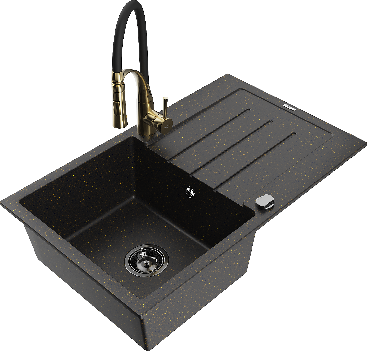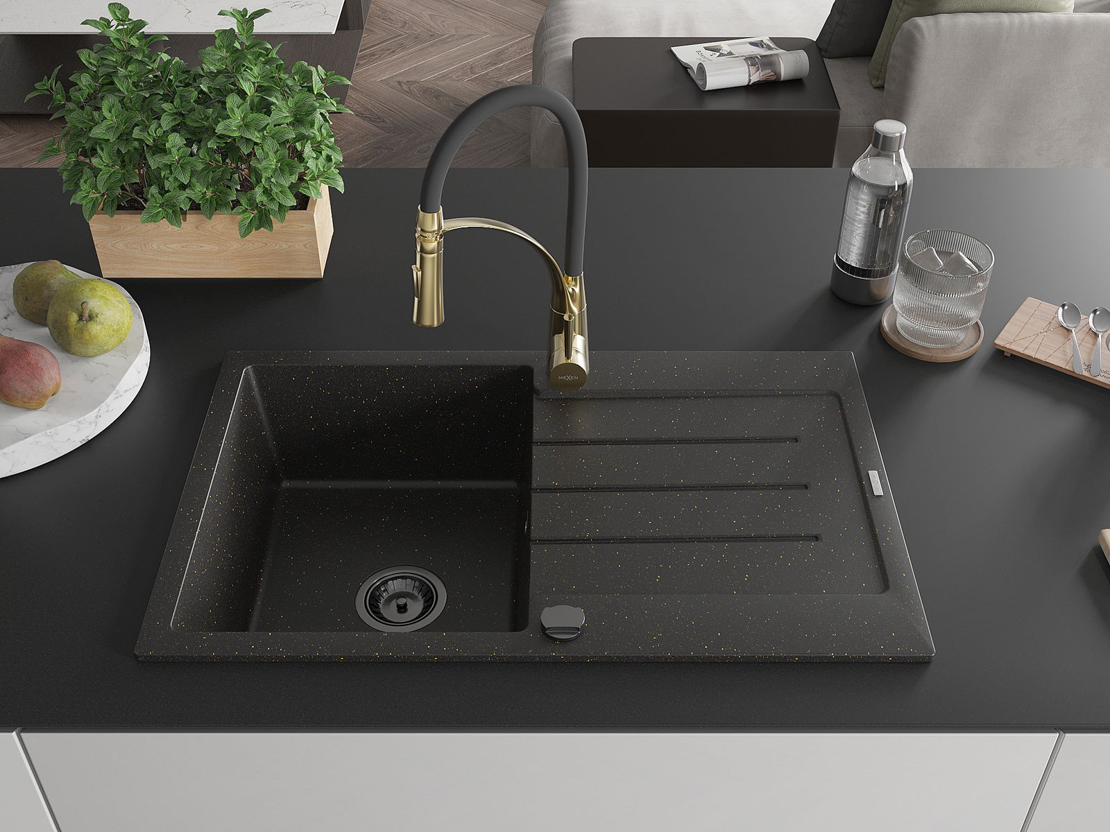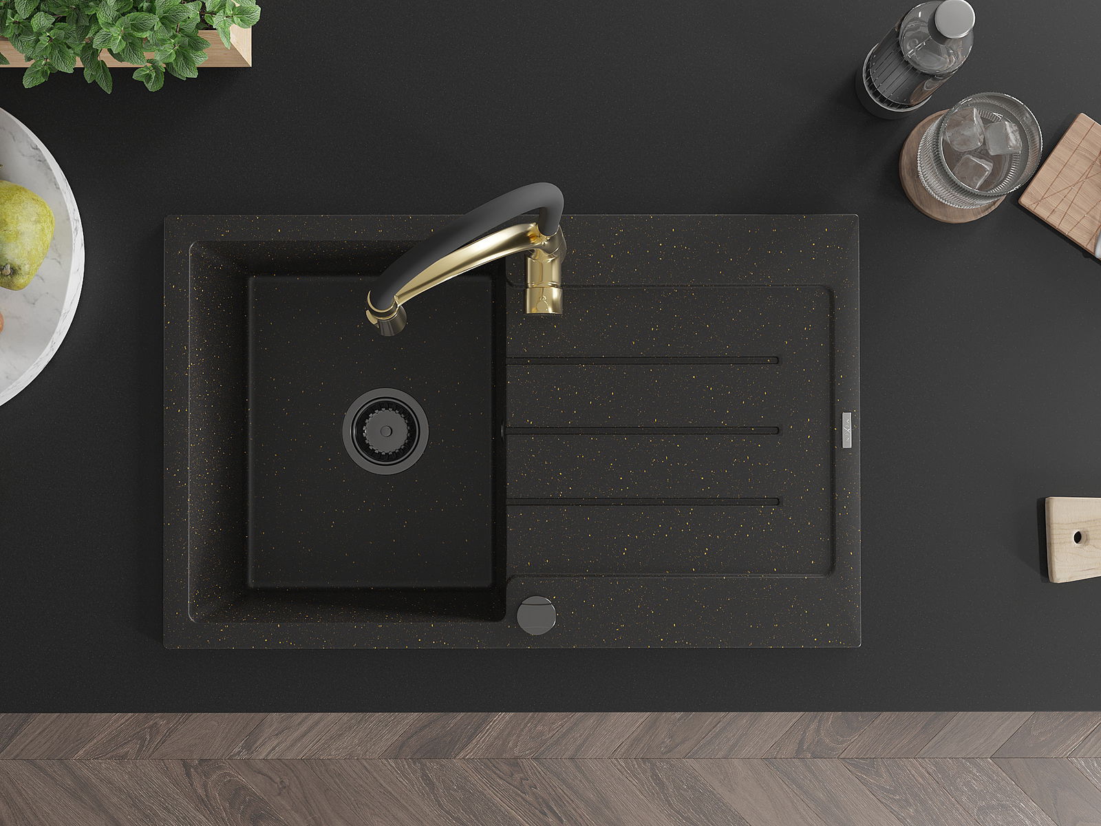 Mexen Bruno chiuvetă de granit cu 1 cuvă cu scurgător și baterie de bucătărie Aster, negru/oro metalic