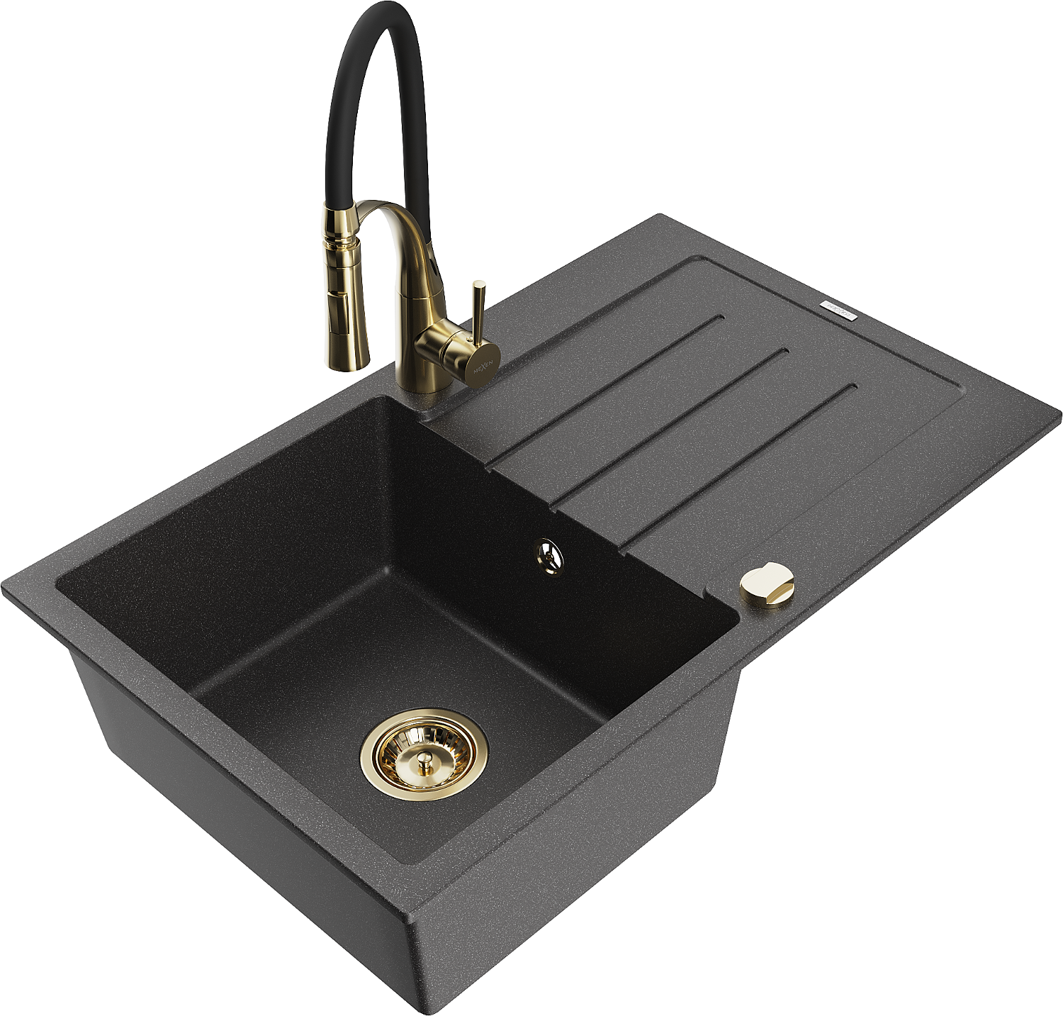 Mexen Bruno chiuvetă de bucătărie din granit cu o singură cuvă, cu scurgător și baterie Aster, neagră pătată
