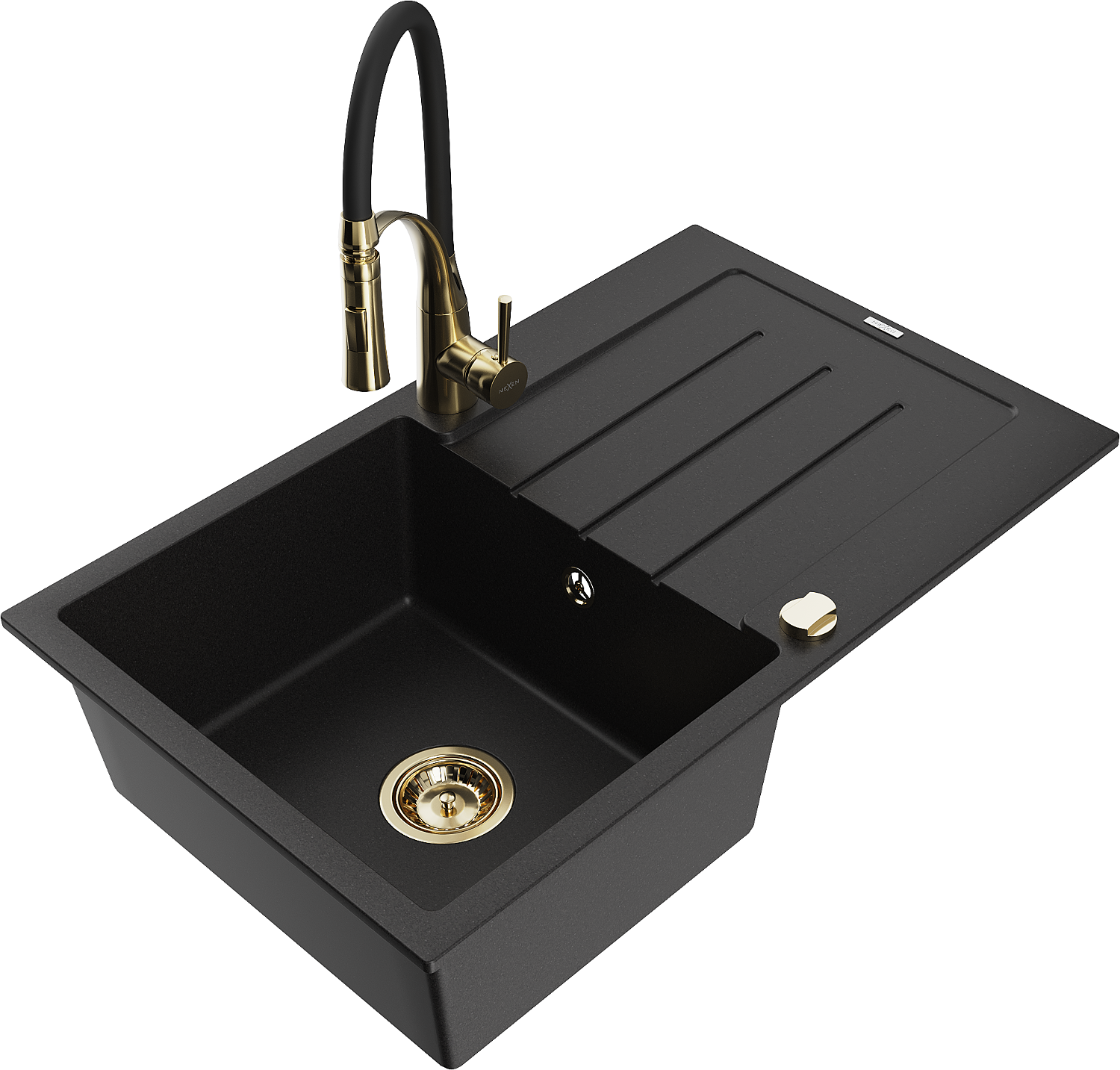 Mexen Bruno chiuvetă de granit cu 1 cuvă și picurator, cu baterie de bucătărie Aster, negru - 6513-77-73450-57-G