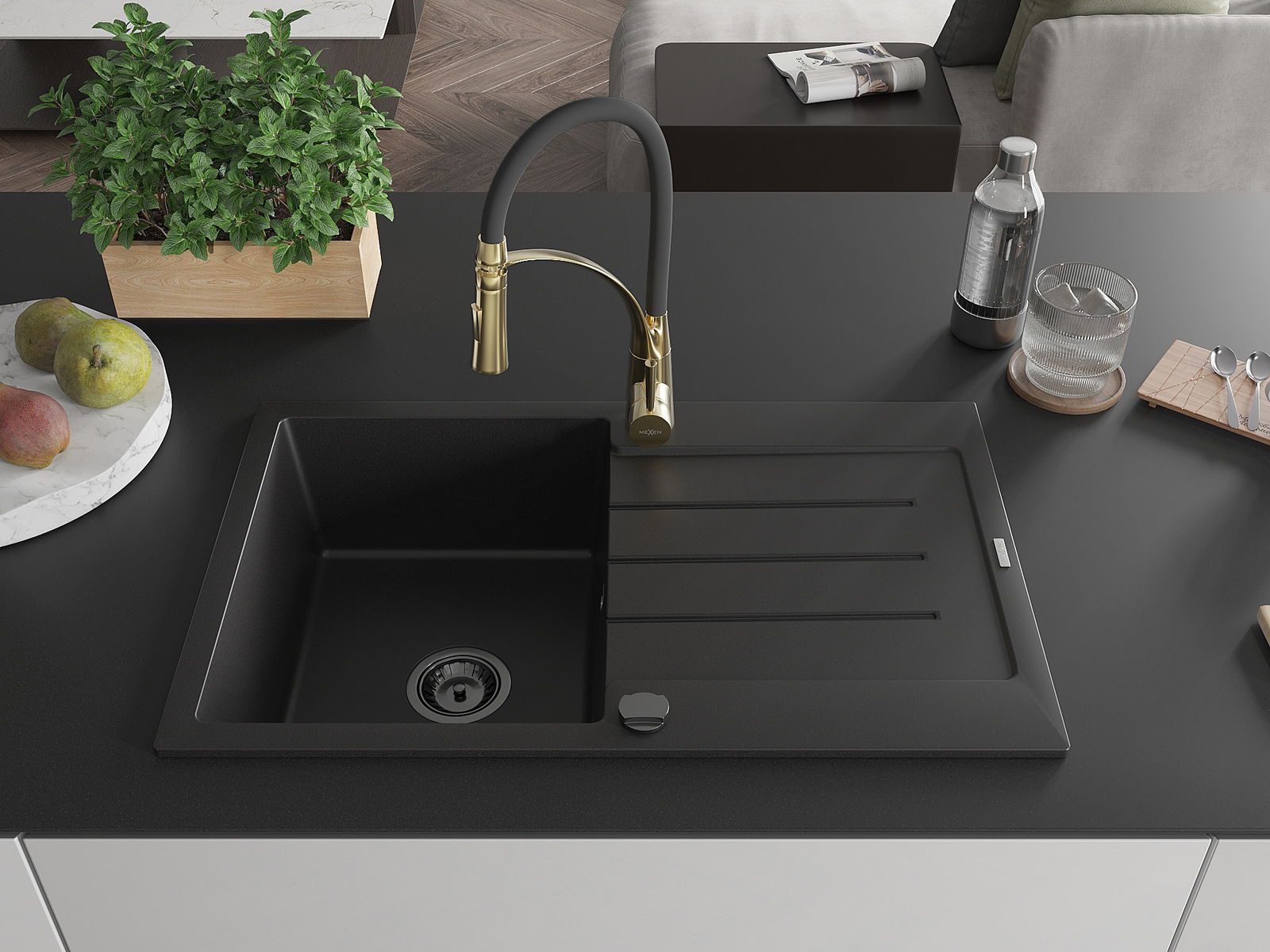 Mexen Bruno chiuvetă de granit cu 1 compartiment, cu scurgător și baterie de bucătărie Aster, negru - 6513-77-73450-57-B