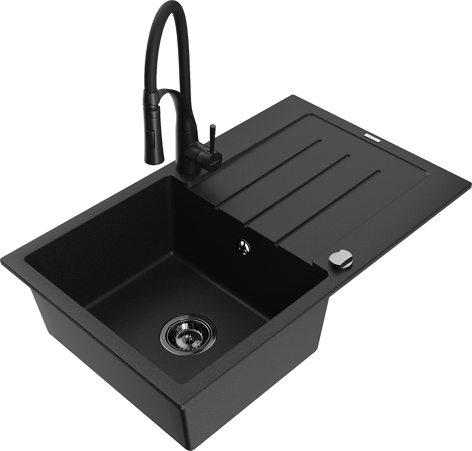 Mexen Bruno chiuvetă de bucătărie din granit cu 1 compartiment cu scurgător și baterie de bucătărie Aster, negru - 6513-77-7345?