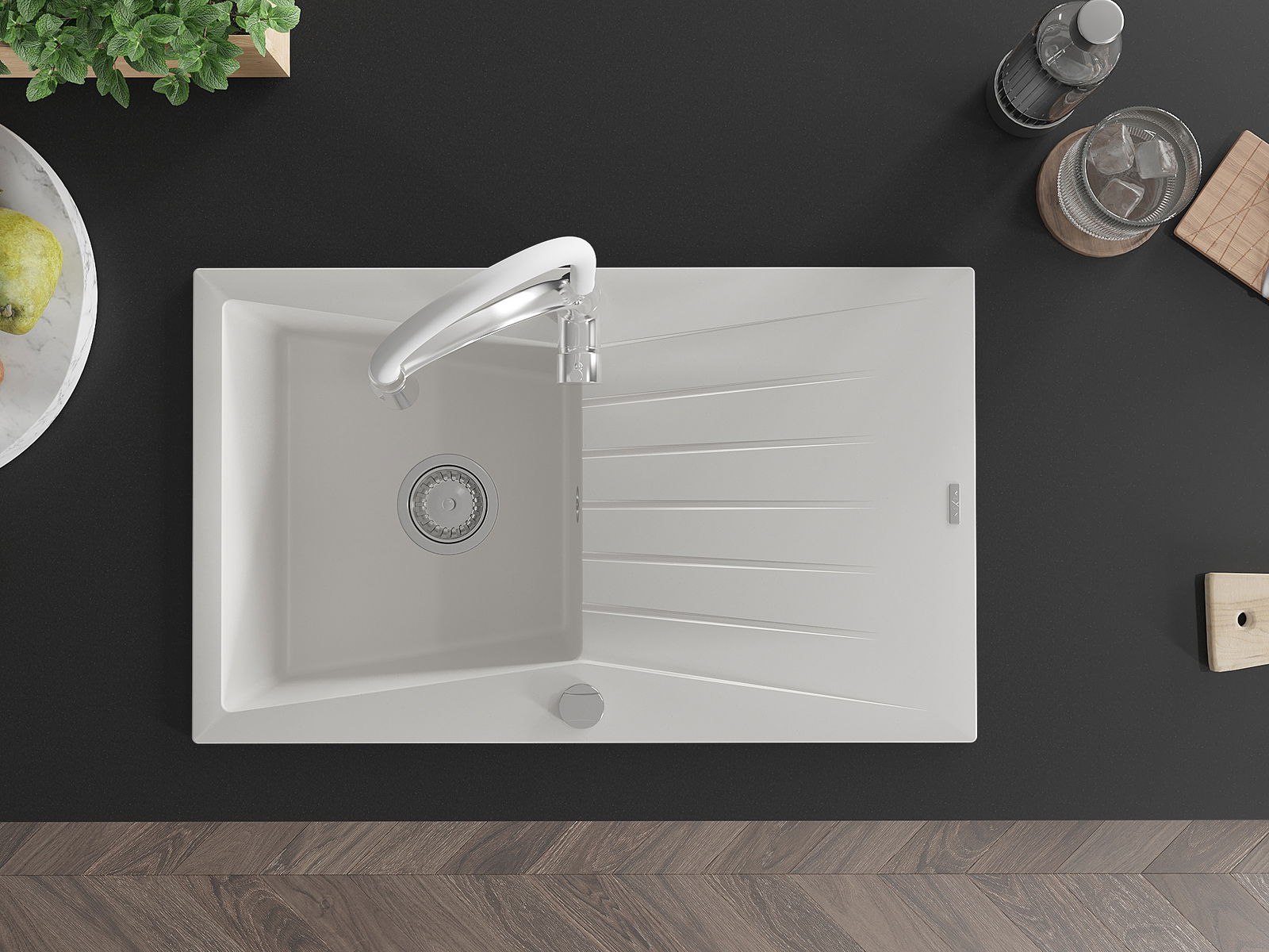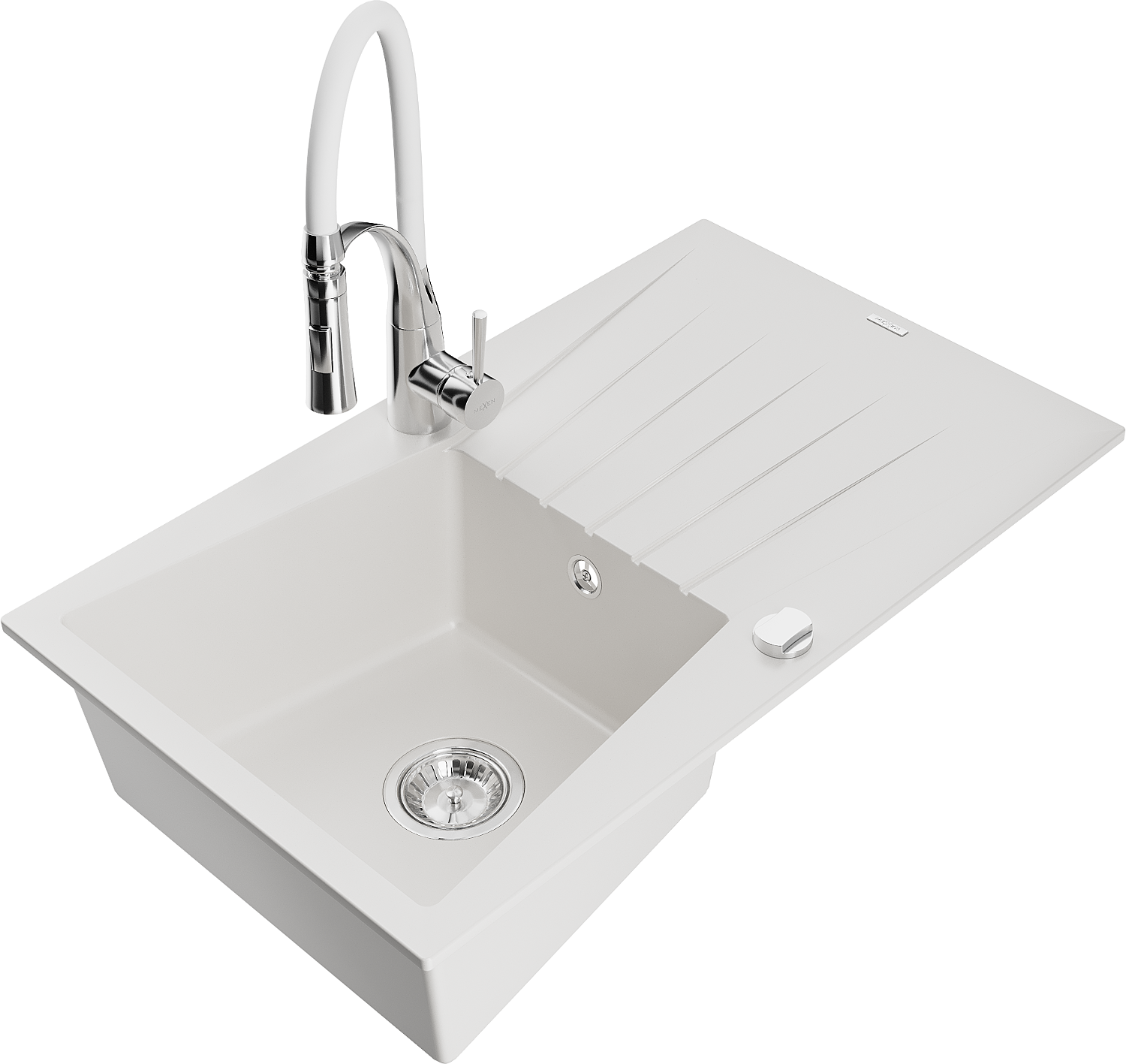 Mexen Cesar chiuvetă de granit cu o singură cuvă și scurgător și baterie de bucătărie Aster, alb - 6514-20-73450-02