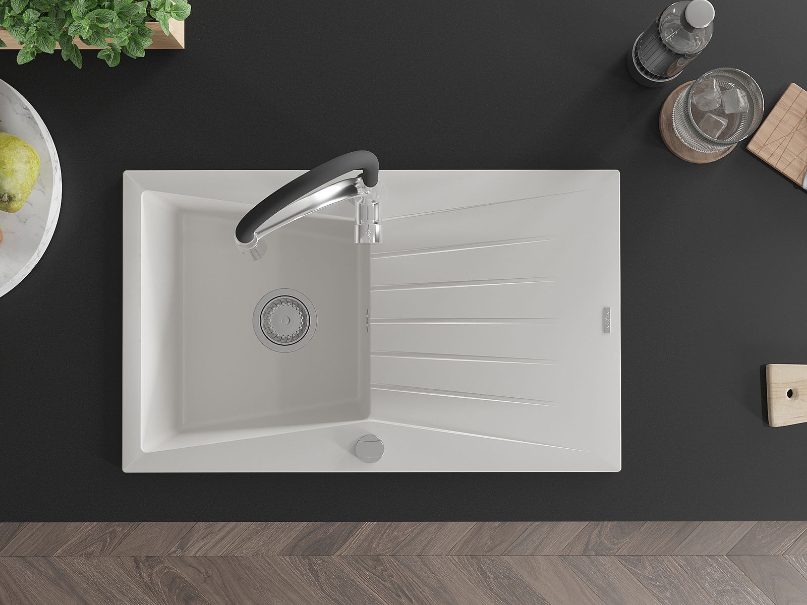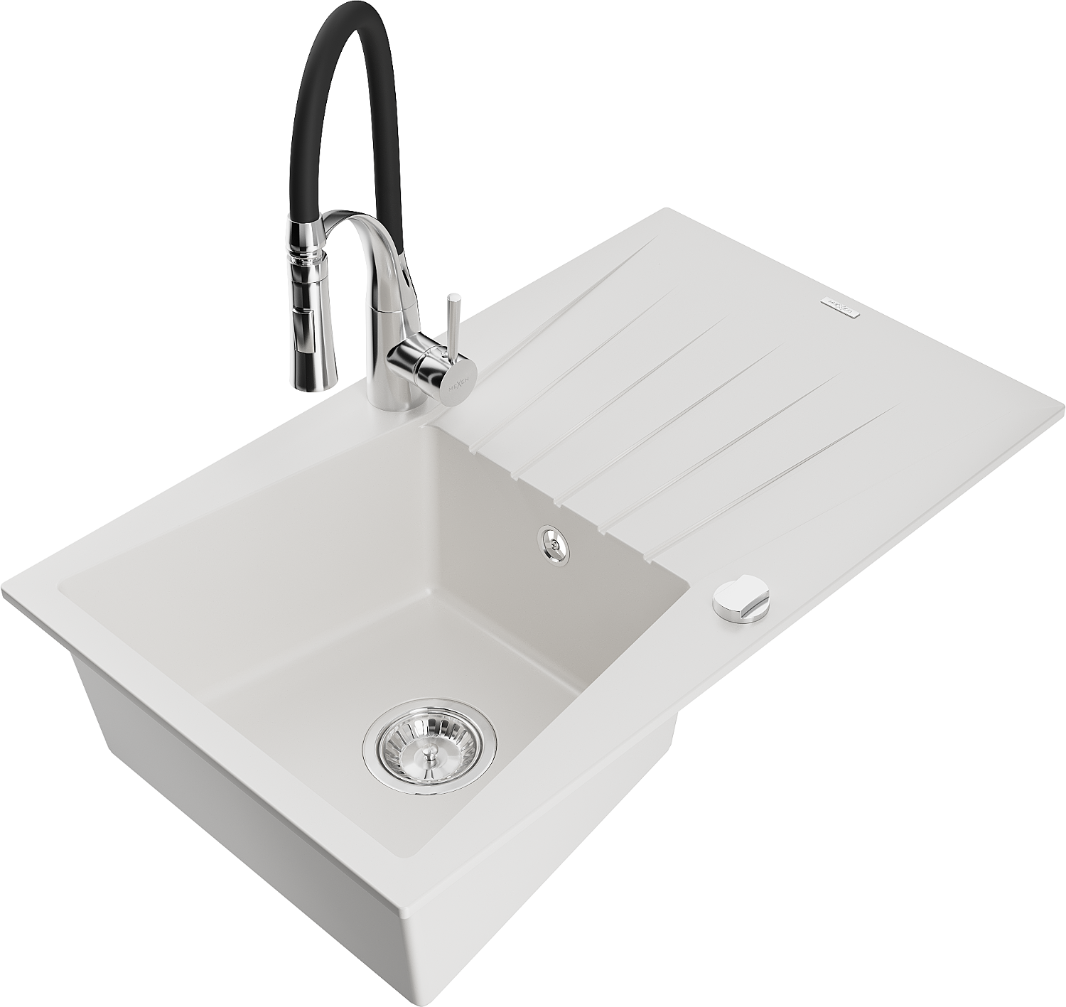 Mexen Cesar chiuvetă de granit cu o singură cuvă cu scurgător și baterie de bucătărie Aster, alb - 6514-20-73450-07