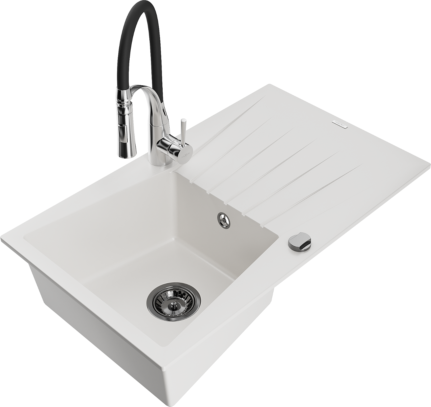 Mexen Cesar chiuvetă de granit cu 1 compartiment cu scurgător și baterie de bucătărie Aster, alb - 6514-20-73450-07-B