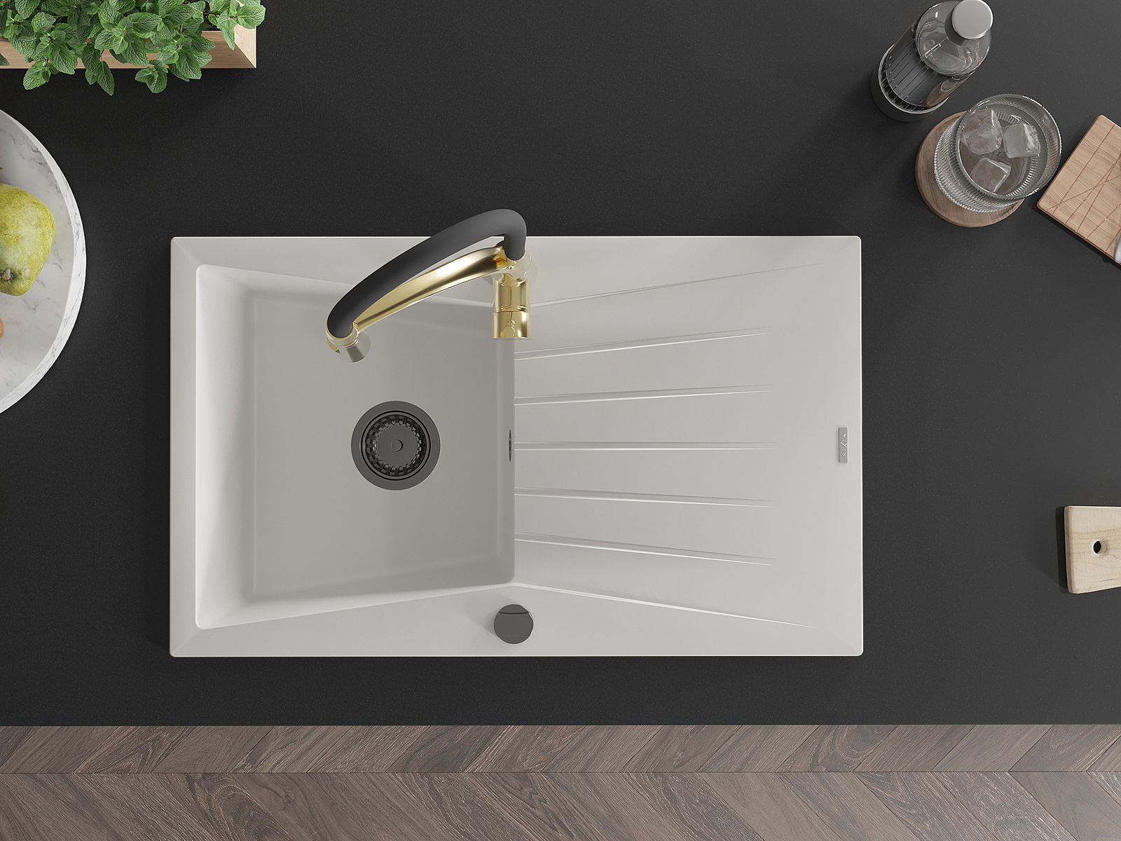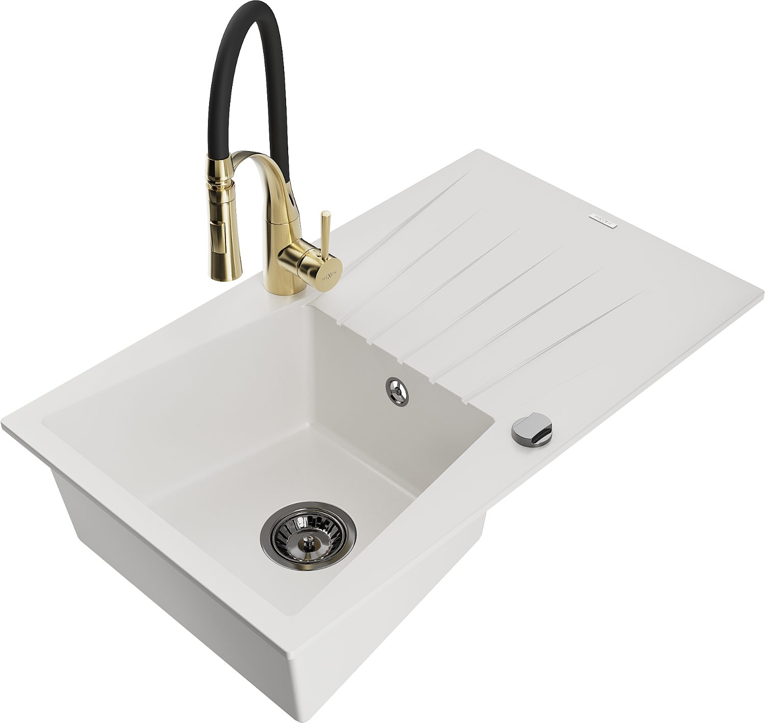 Mexen Cesar chiuvetă de granit cu 1 compartiment cu scurgător și baterie de bucătărie Aster, albă - 6514-20-73450-57-B