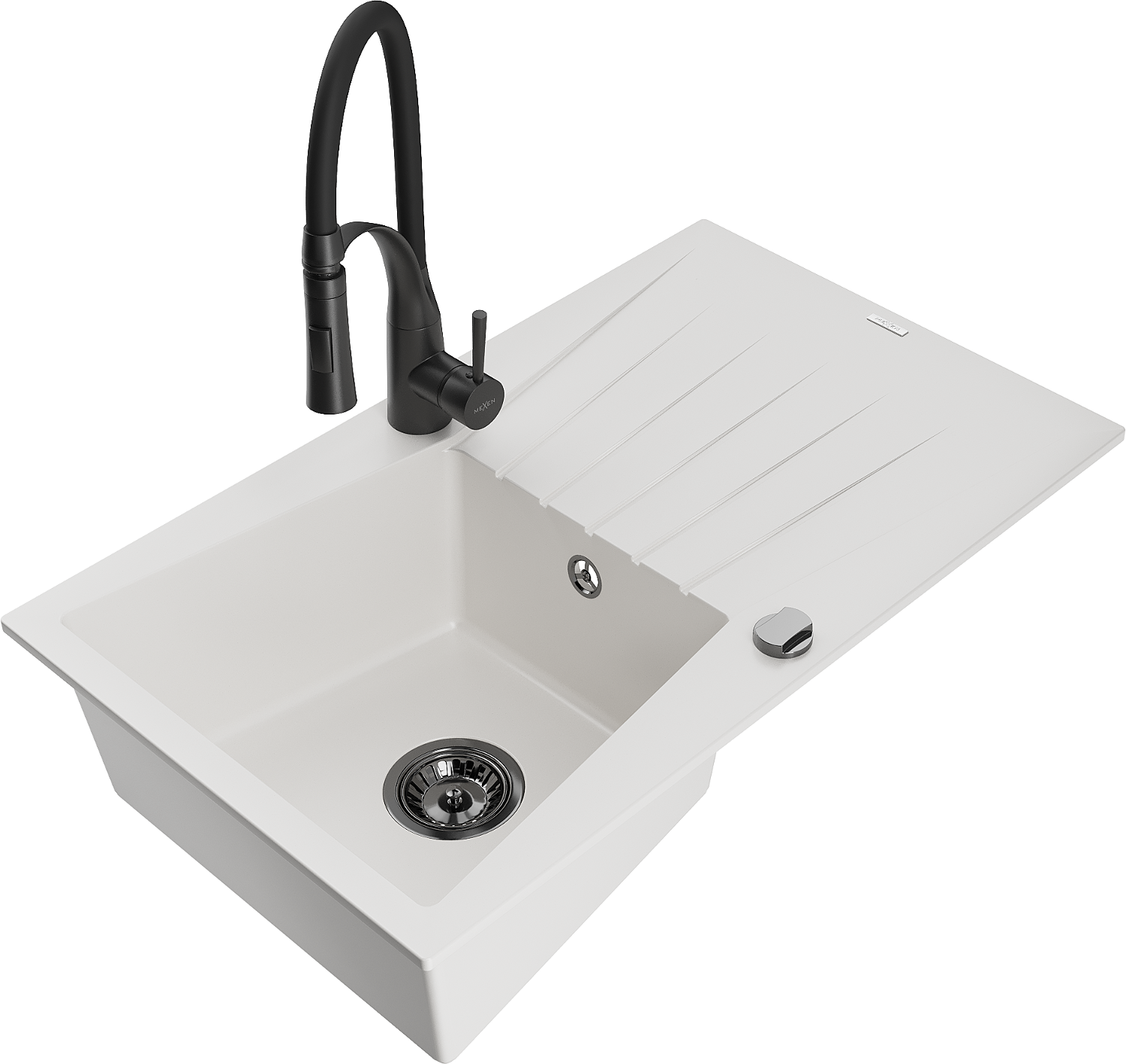 Mexen Cesar chiuvetă de granit cu 1 compartiment, cu scurgător și baterie de bucătărie Aster, alb - 6514-20-73450-70-B