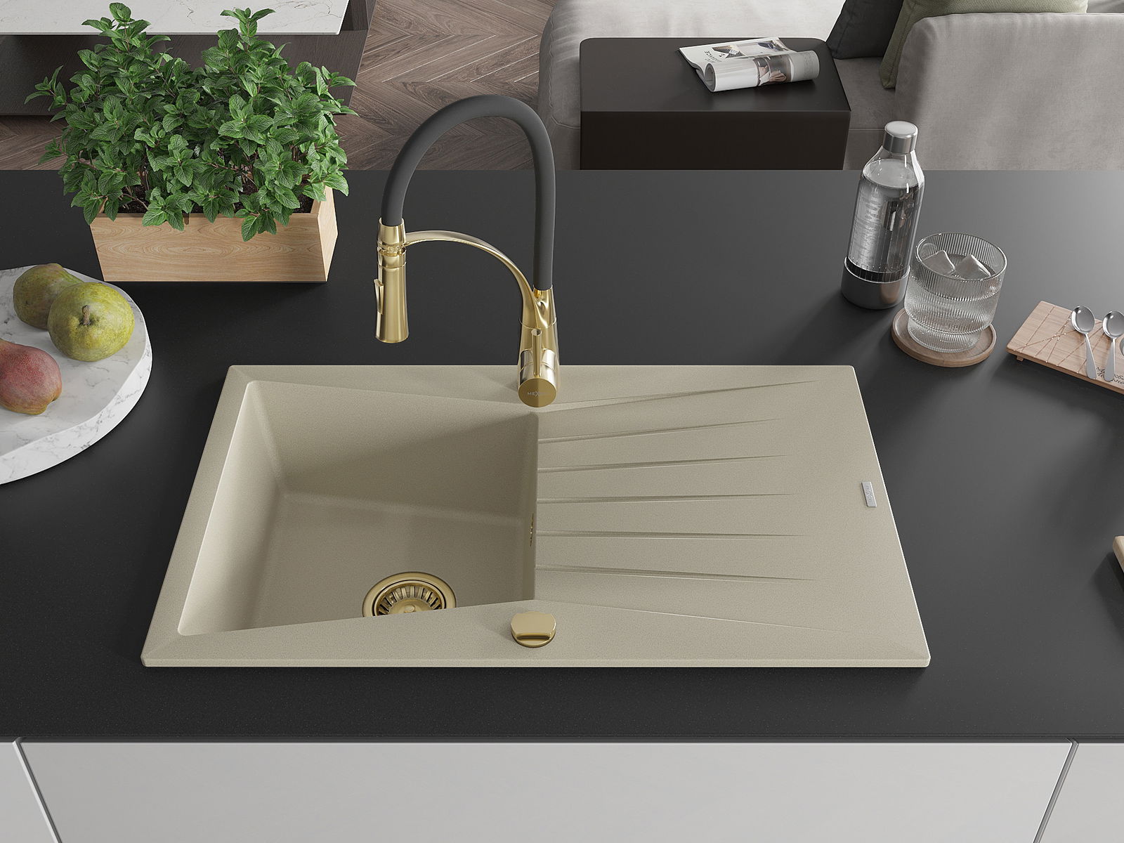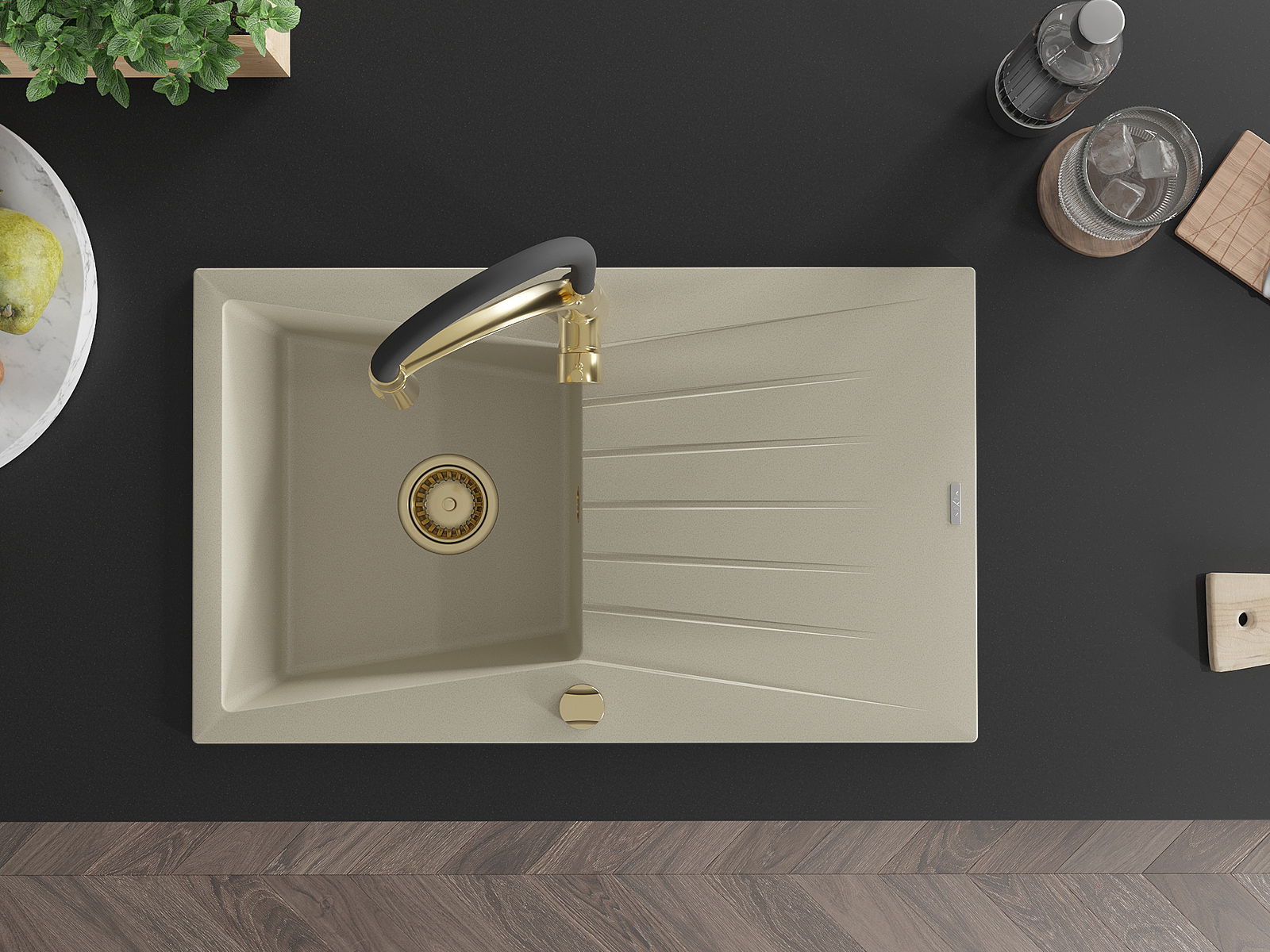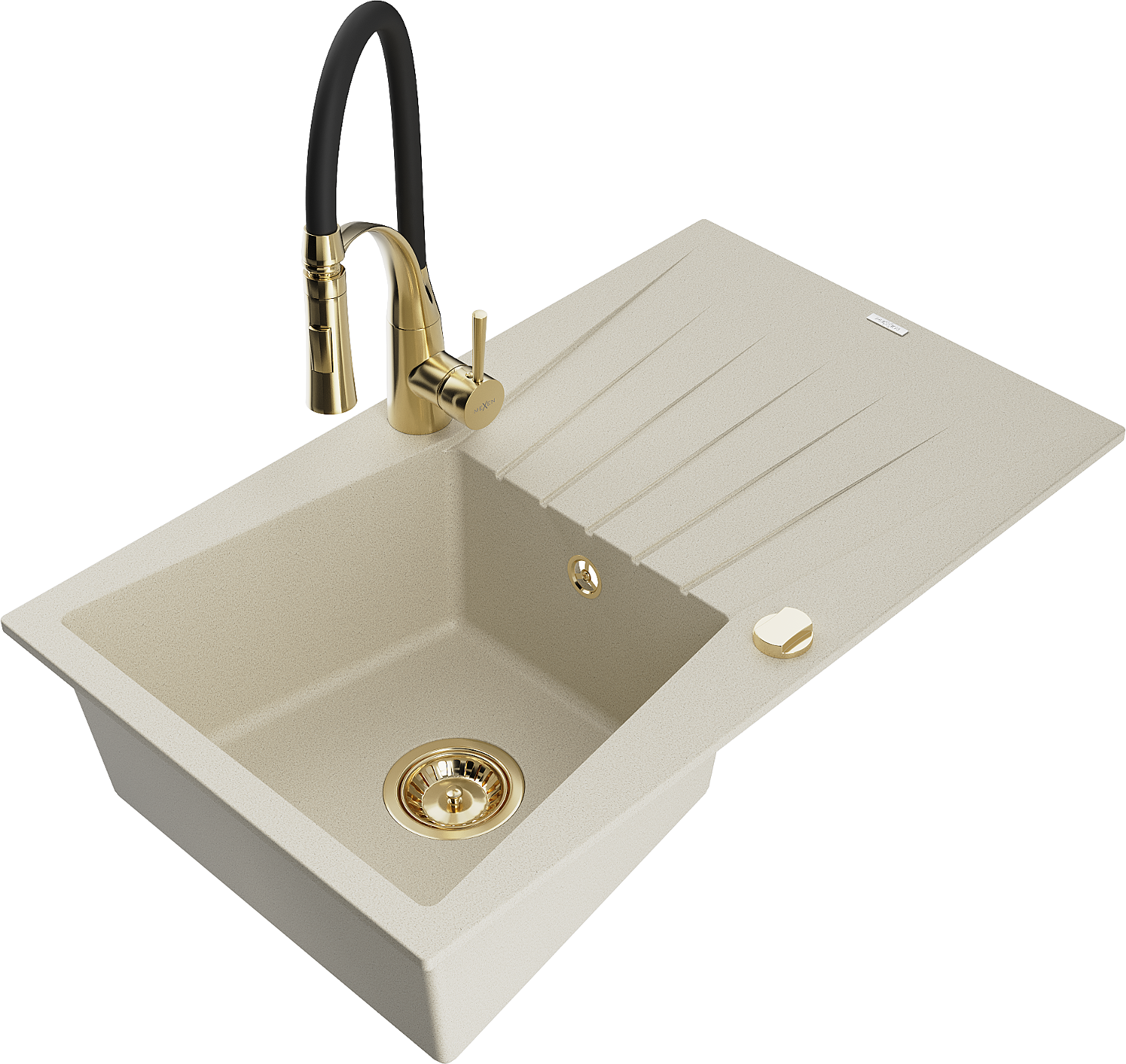 Mexen Cesar chiuvetă de granit cu 1 cuvă cu scurgător și baterie de bucătărie Aster, bej - 6514-69-73450-57-G
