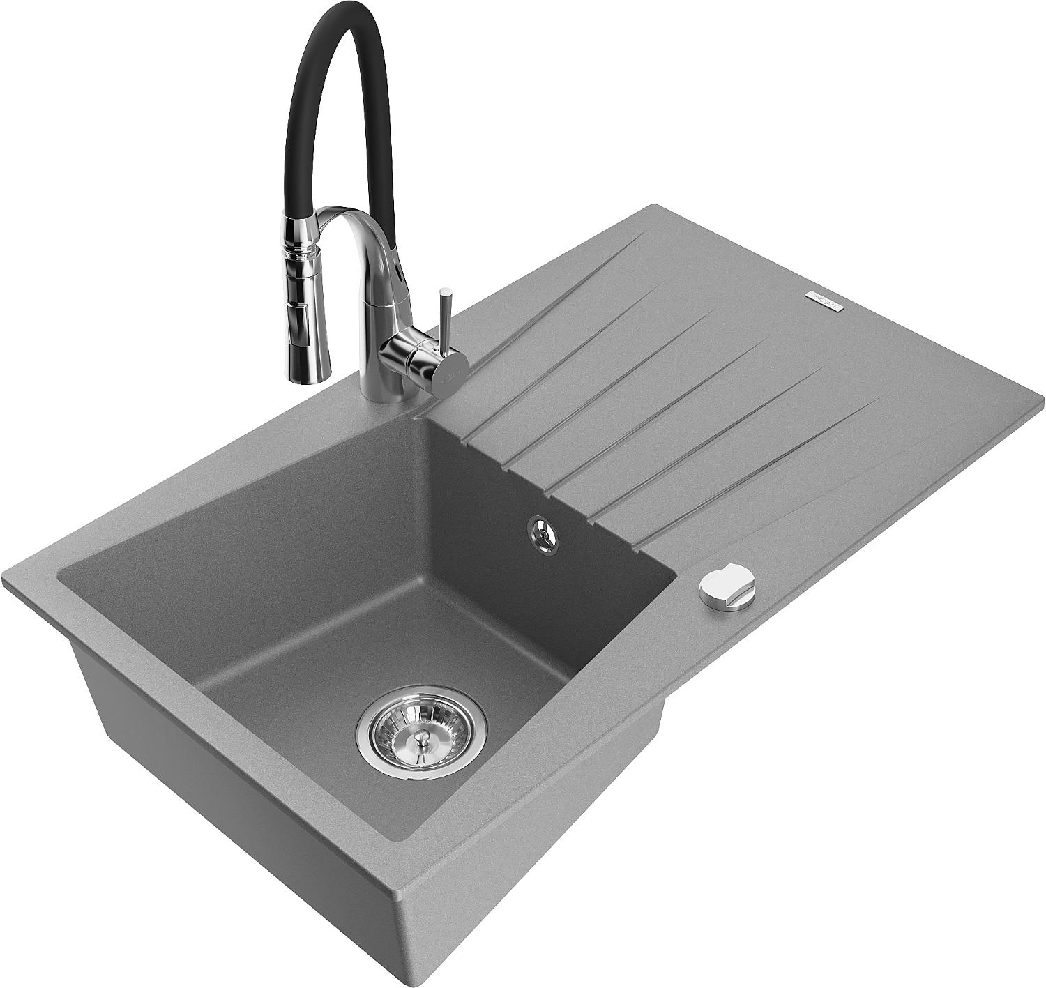 Mexen Cesar chiuvetă granit 1-cameră cu scurgător și baterie de bucătărie Aster, gri - 6514-71-73450-07