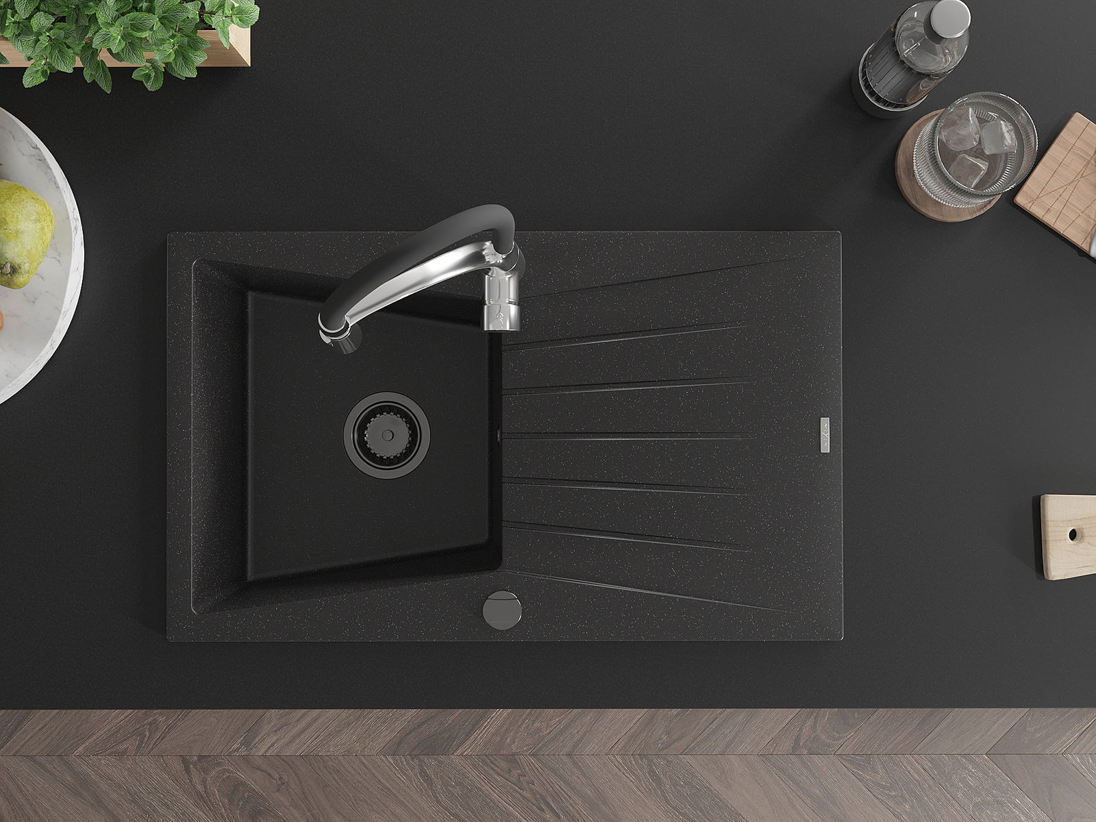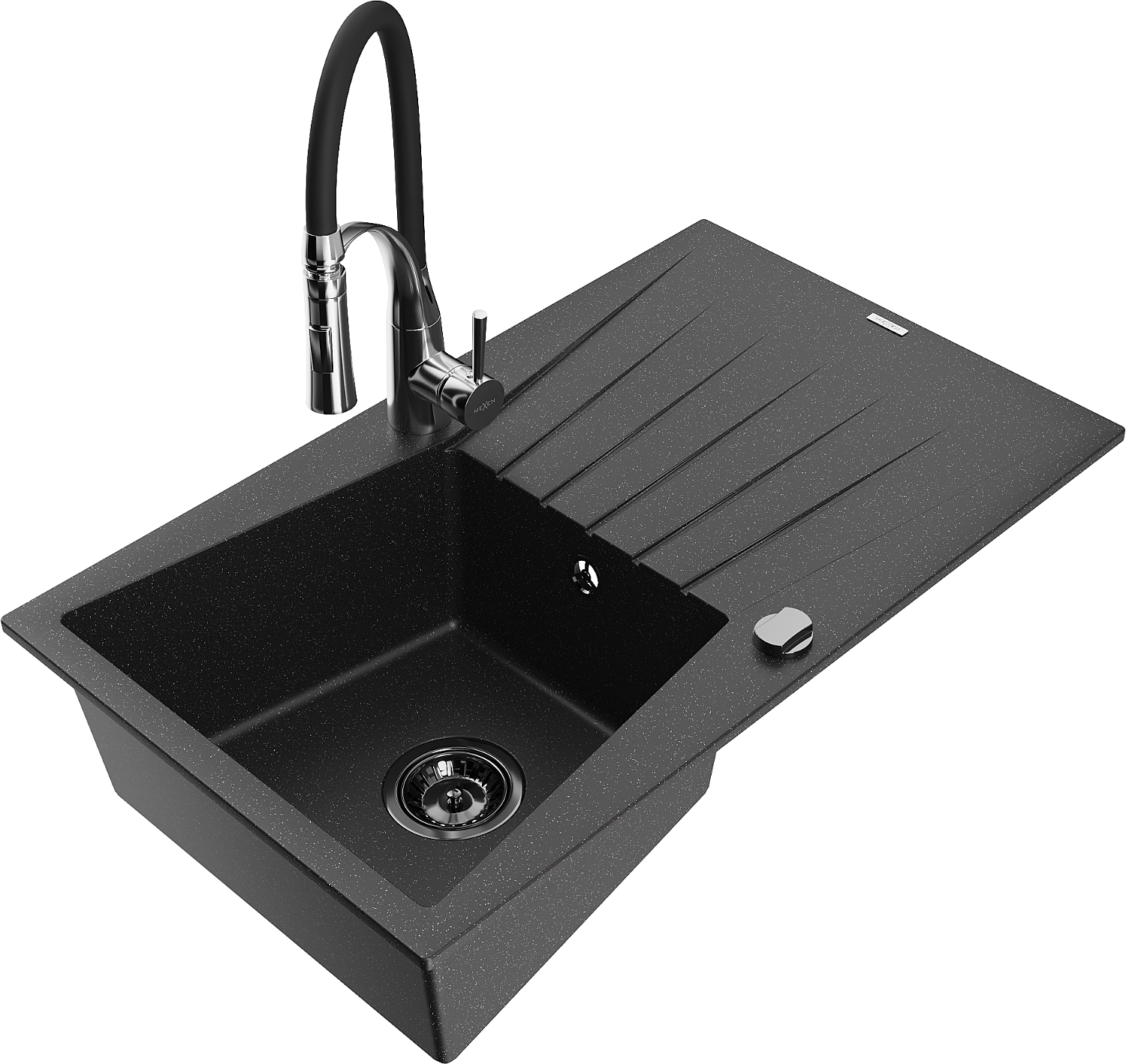 Mexen Cesar chiuvetă de granit cu 1 cuvă cu scurgător și baterie de bucătărie Aster, negru/argintiu metalizat