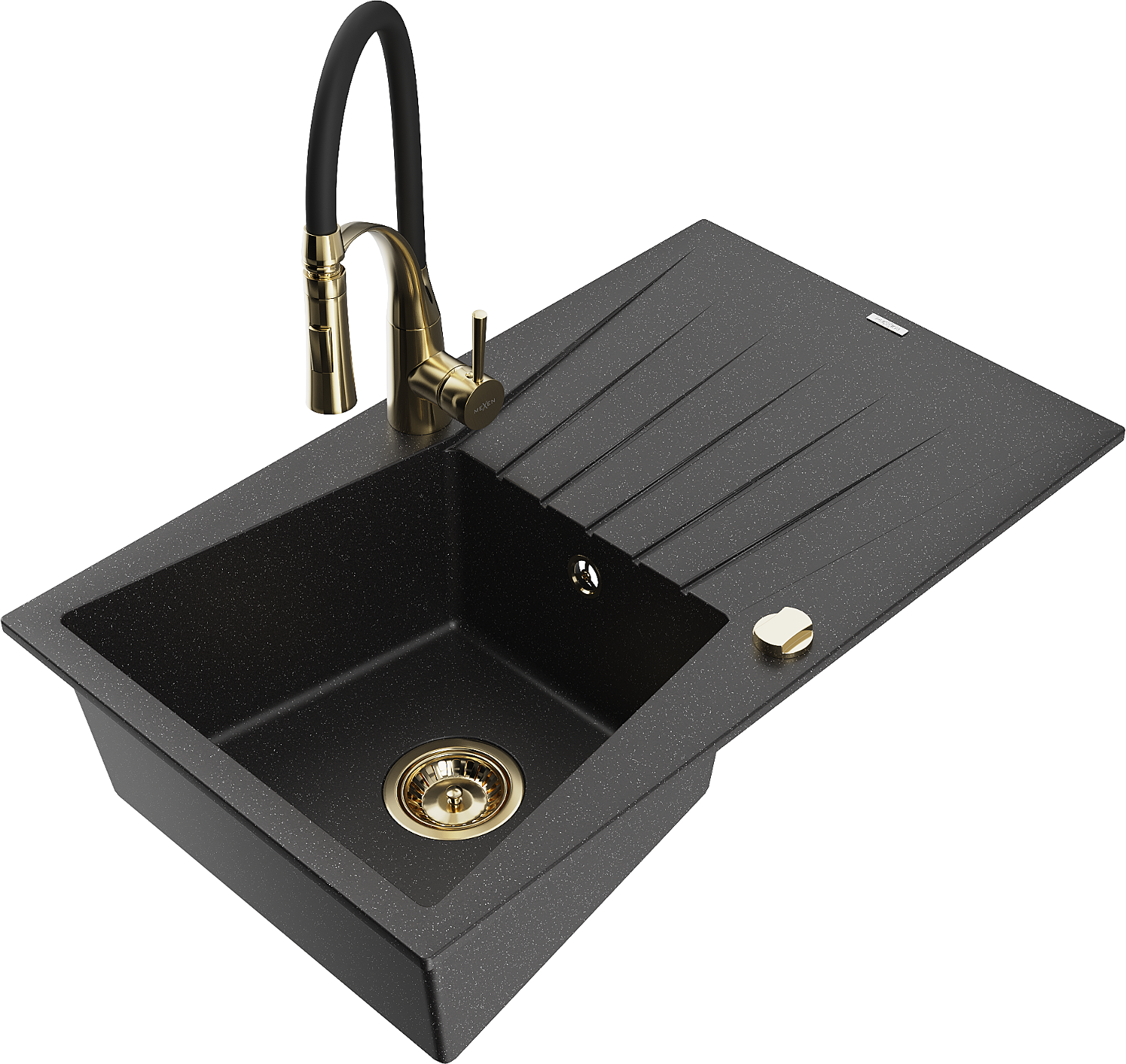 Mexen Cesar chiuvetă de bucătărie din granit cu 1 cuvă, cu scurgător și robinet Aster, negru/argintiu metalic