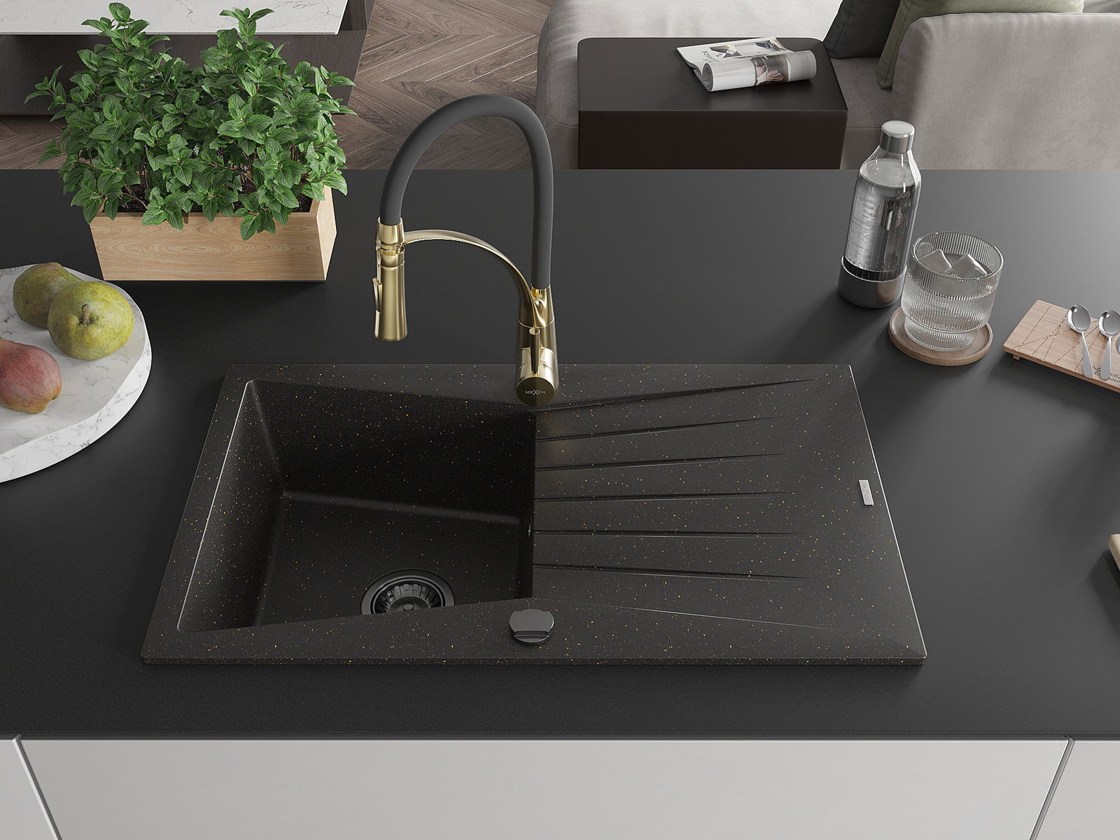 Mexen Cesar chiuvetă din granit cu 1 compartiment, cu scurgător și baterie de bucătărie Aster, negru/auriu metalizat