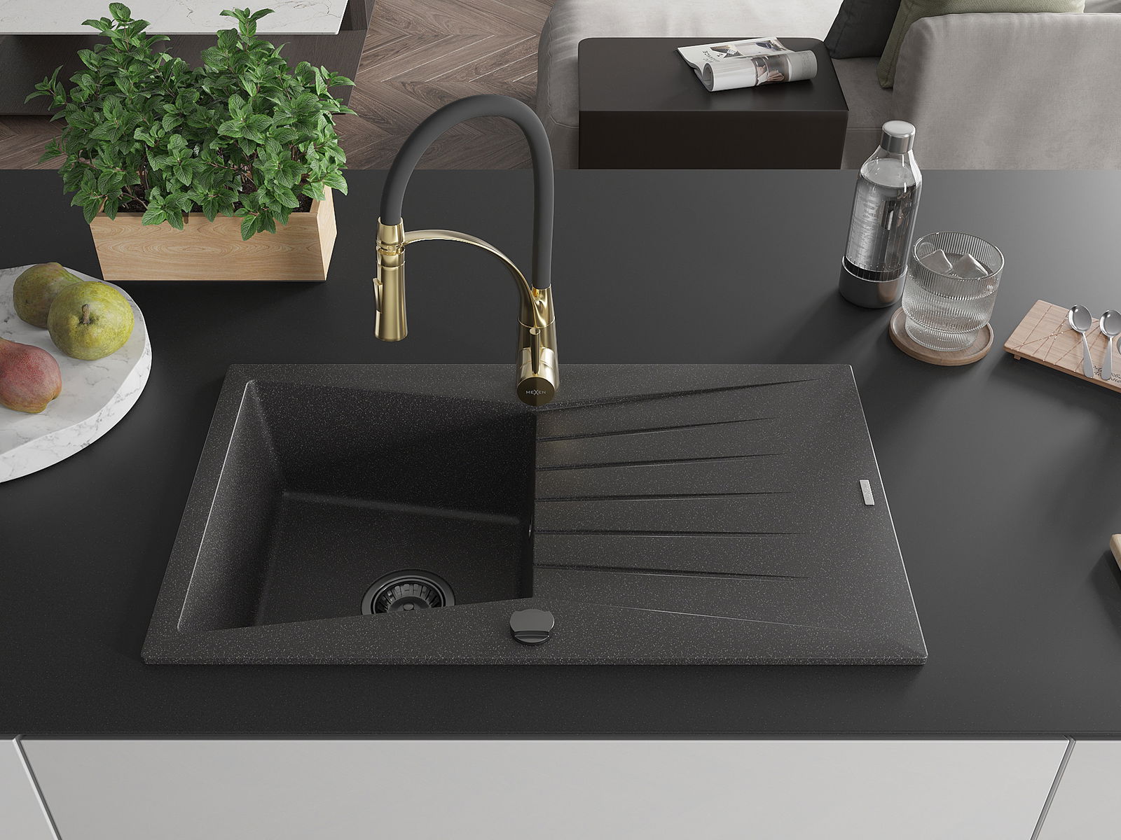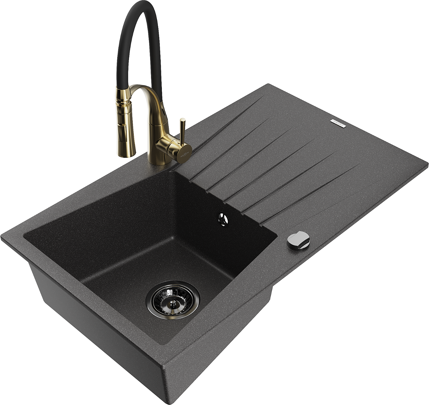 Mexen Cesar chiuvetă din granit cu 1 compartiment cu scurgător și baterie de bucătărie Aster, negru cu pete