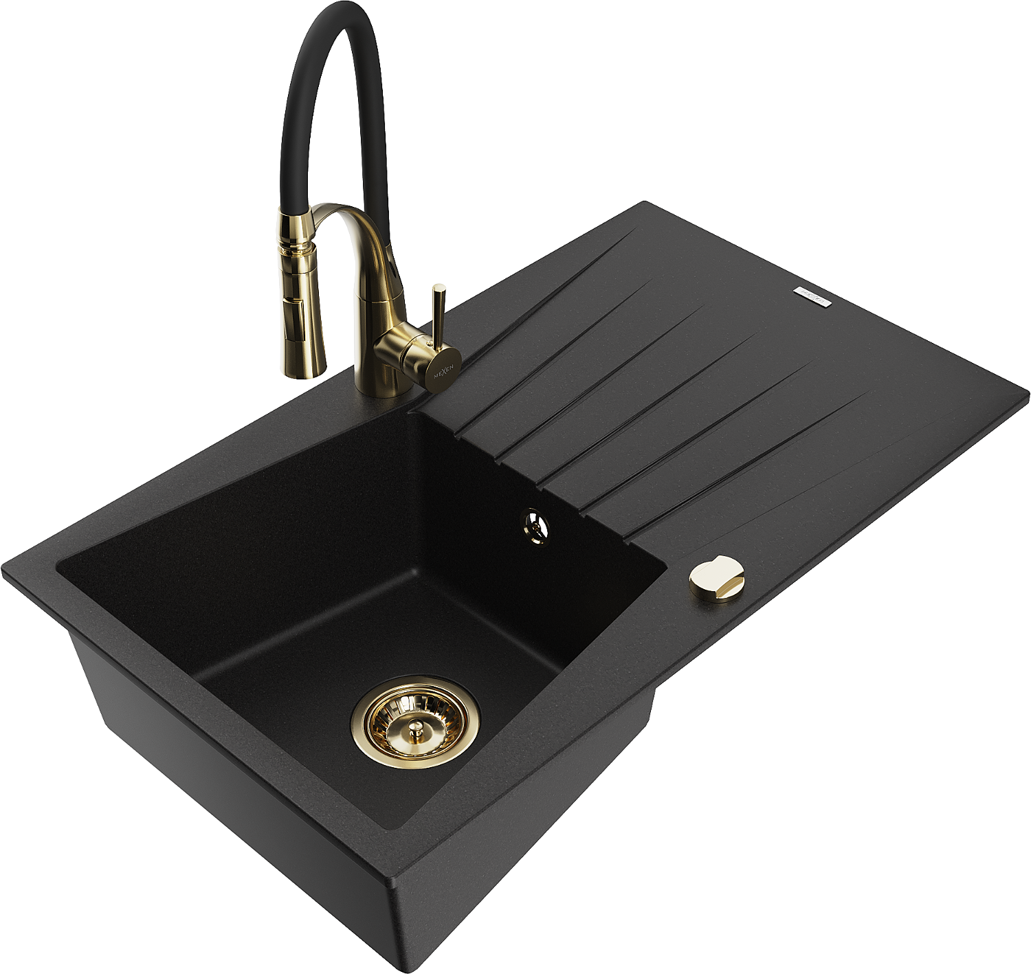 Mexen Cesar chiuvetă de bucătărie din granit cu 1 cuvă și scurgător și baterie de bucătărie Aster, negru - 6514-77-73450-57-G