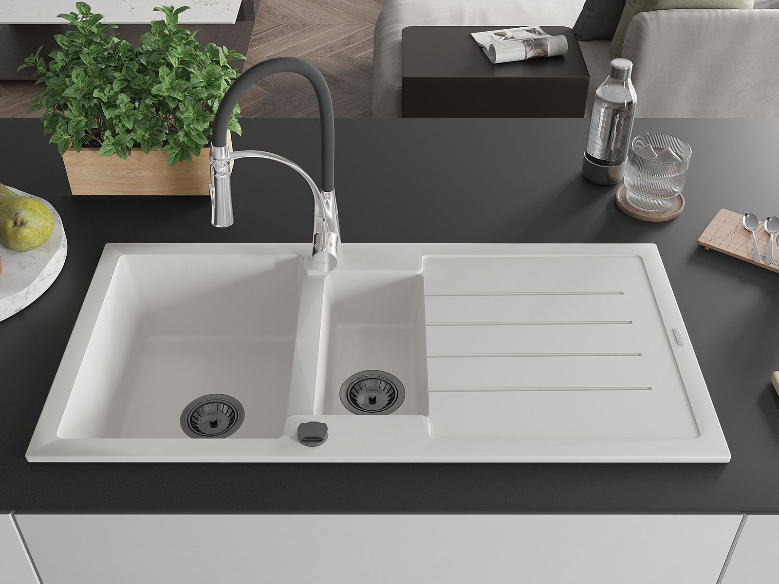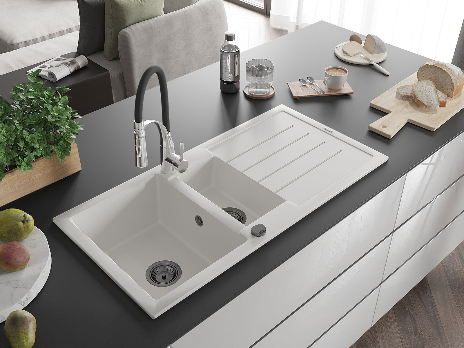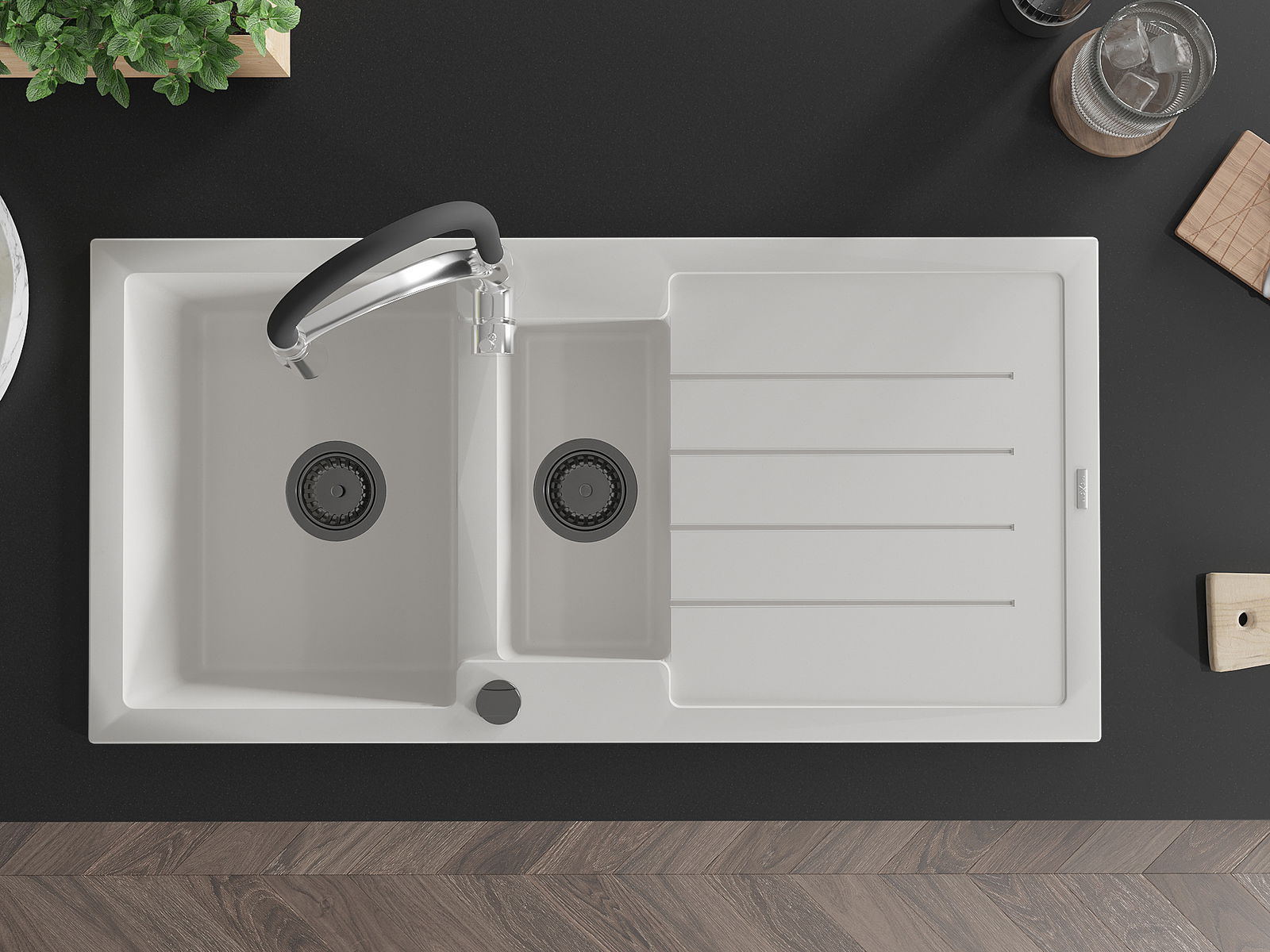 Mexen Andres chiuvetă din granit 1,5 compartimente cu scurgător și baterie de bucătărie Aster, alb - 6515-20-73450-07-B