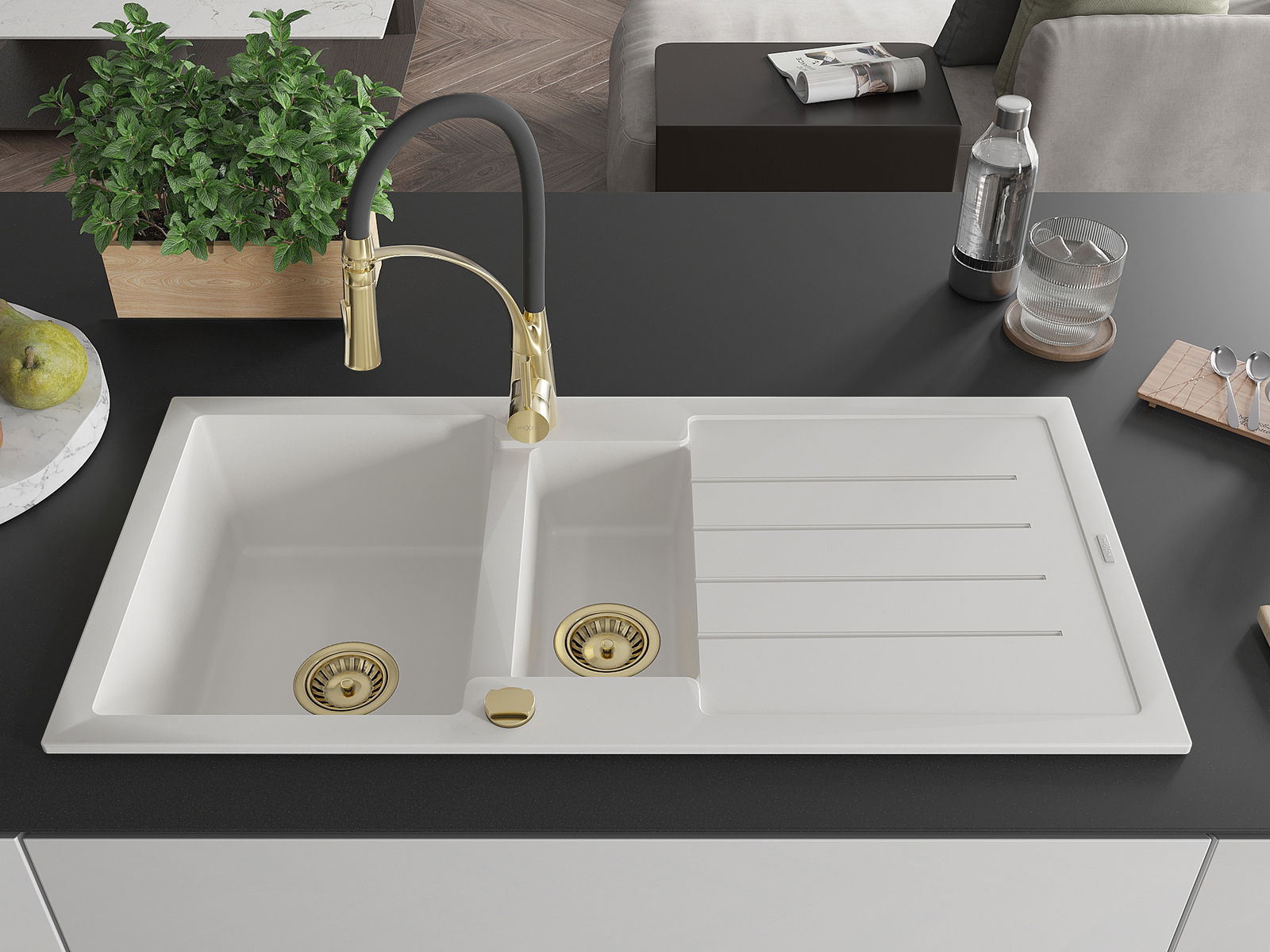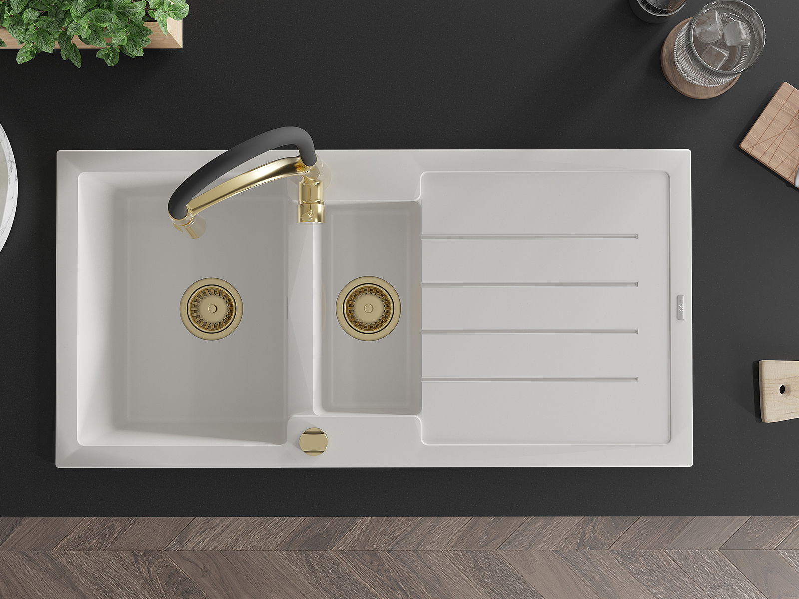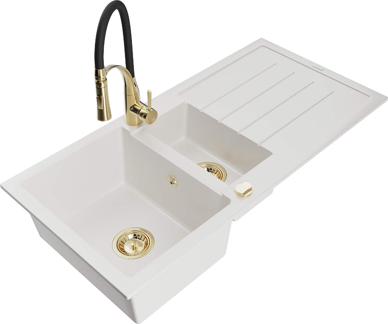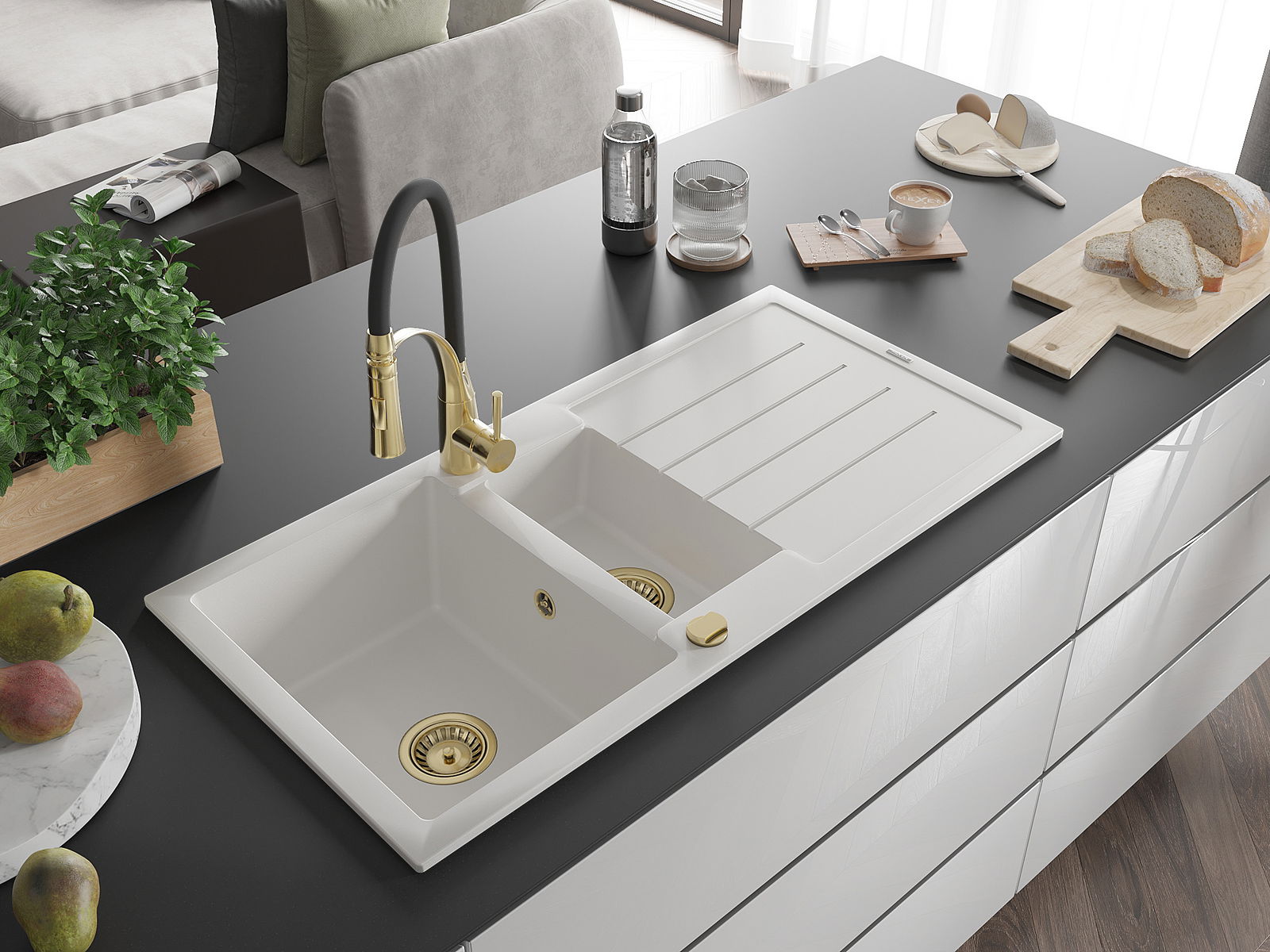Mexen Andres chiuvetă din granit cu 1,5 compartimente și scurgător și baterie de bucătărie Aster, alb - 6515-20-73450-57-G