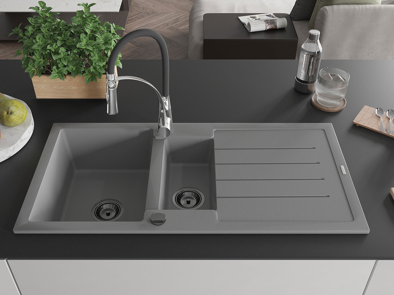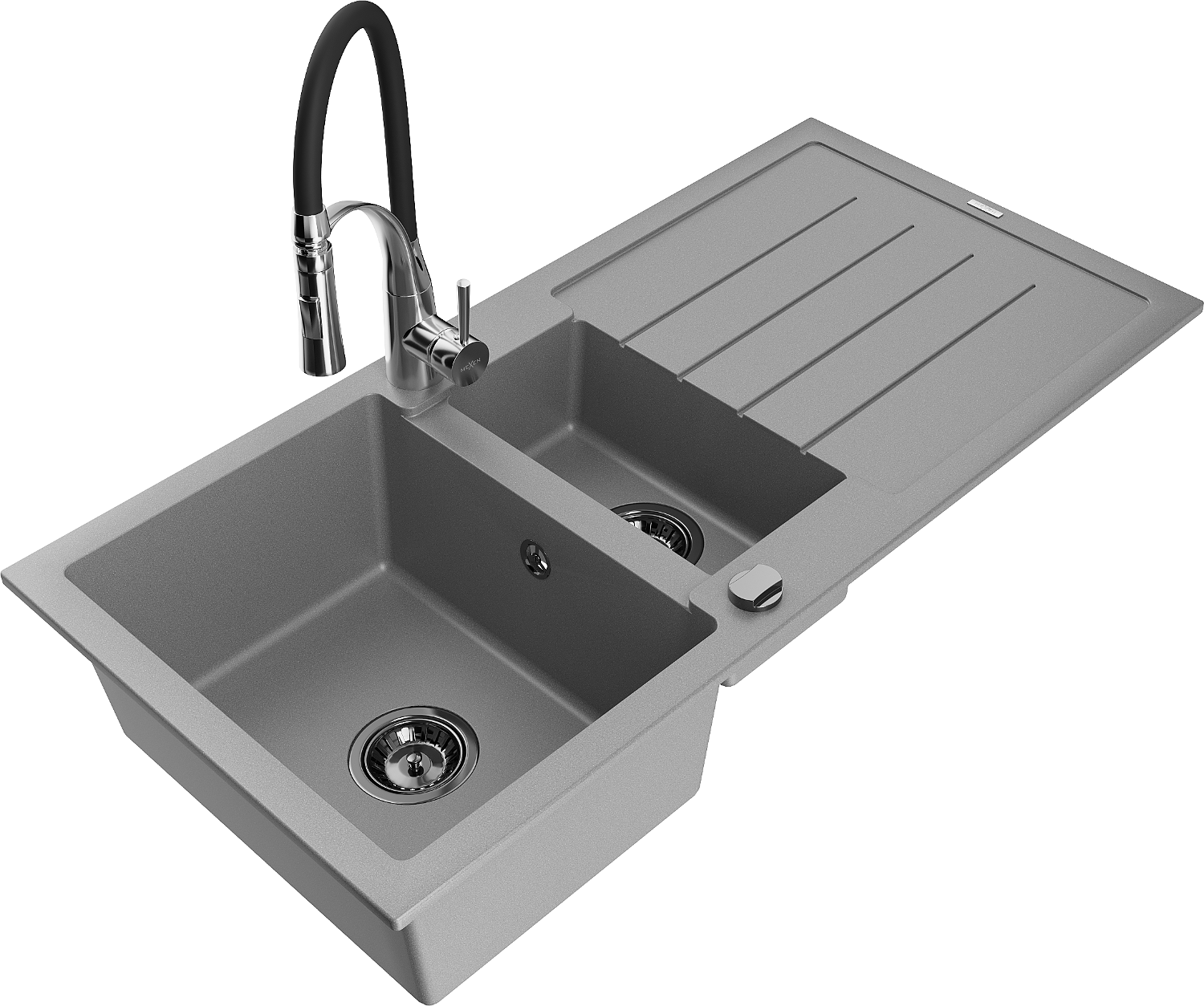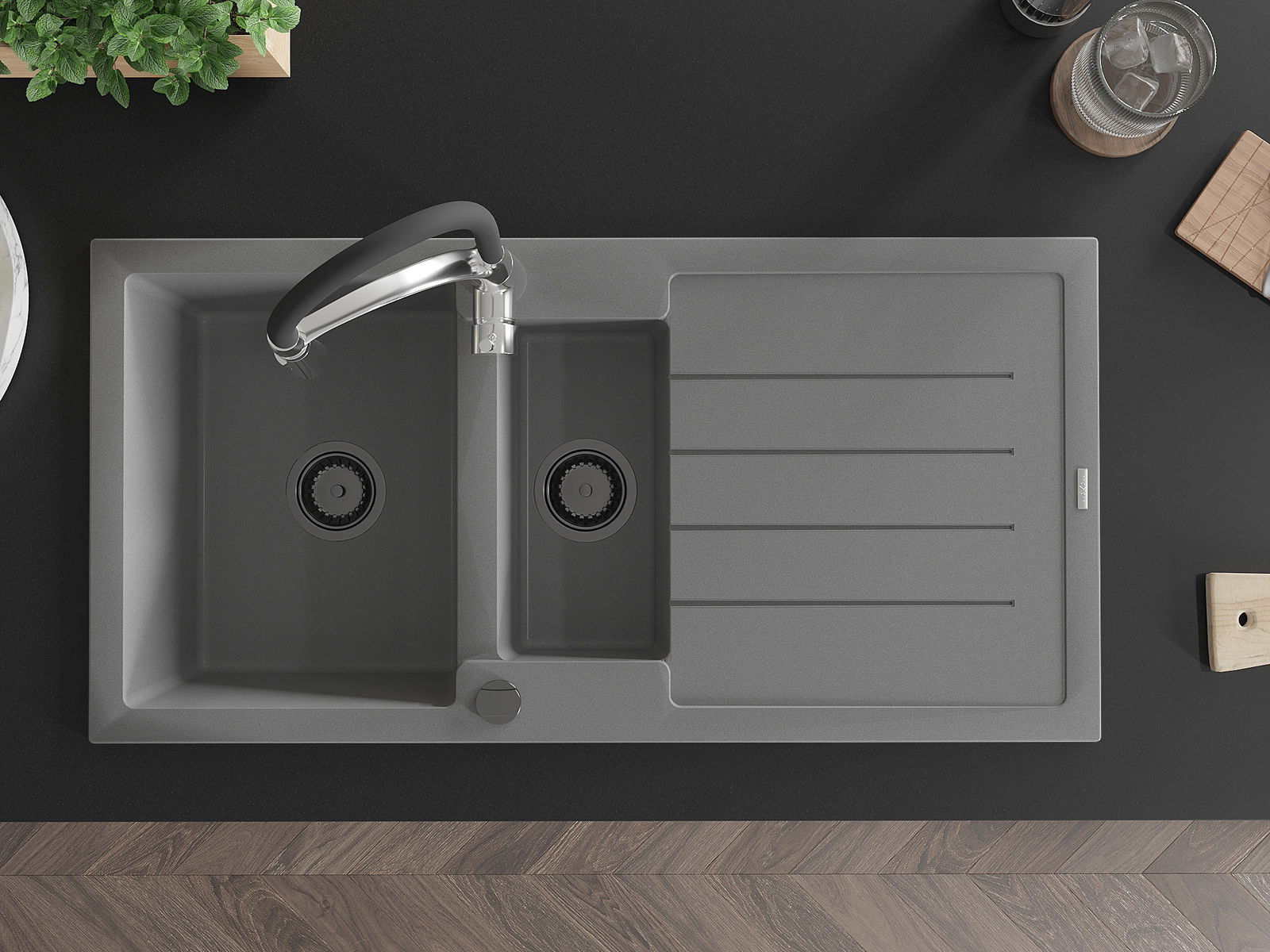 Mexen Andres chiuvetă din granit cu 1,5 camere și scurgător și baterie de bucătărie Aster, gri - 6515-71-73450-07-B