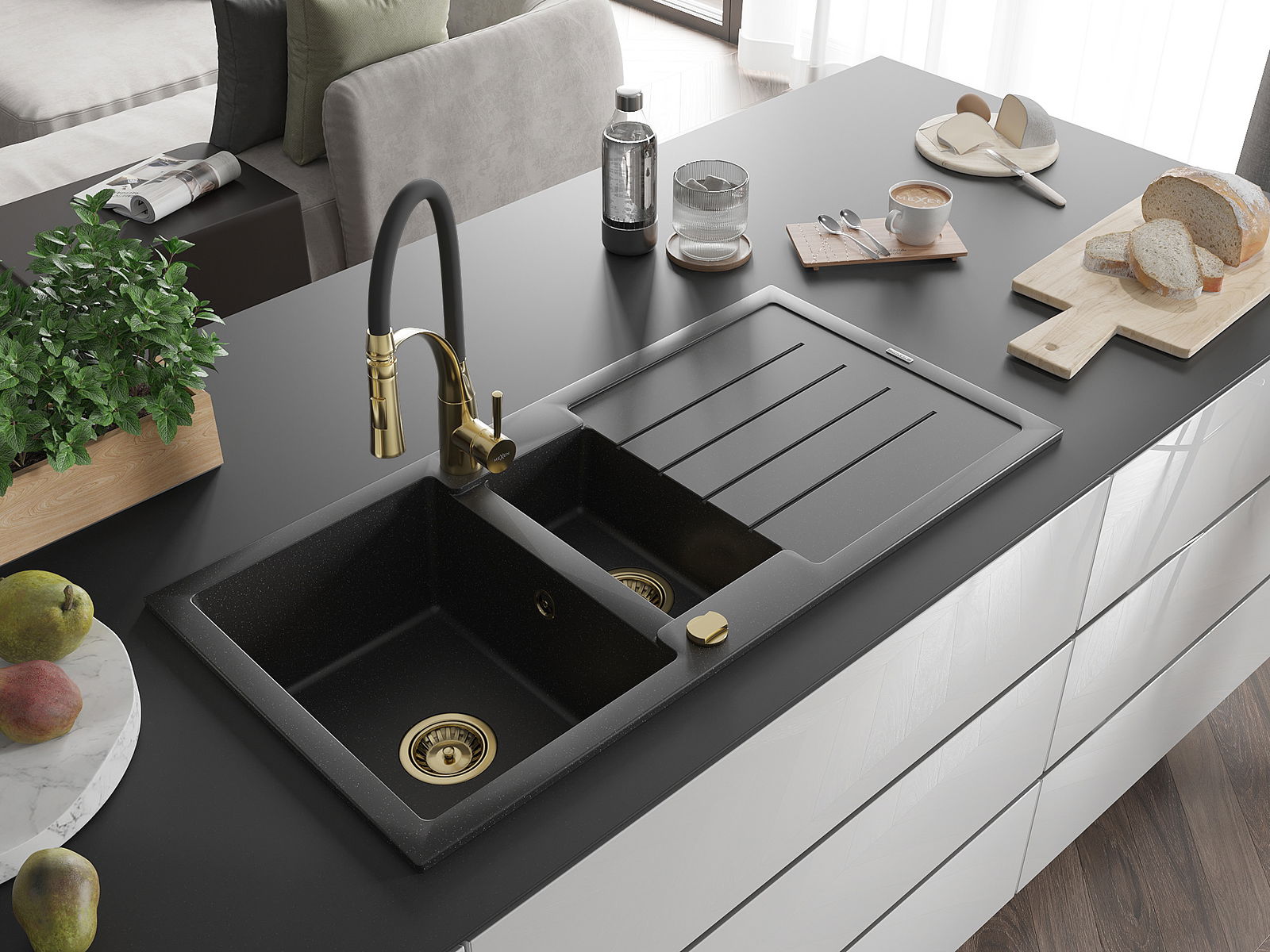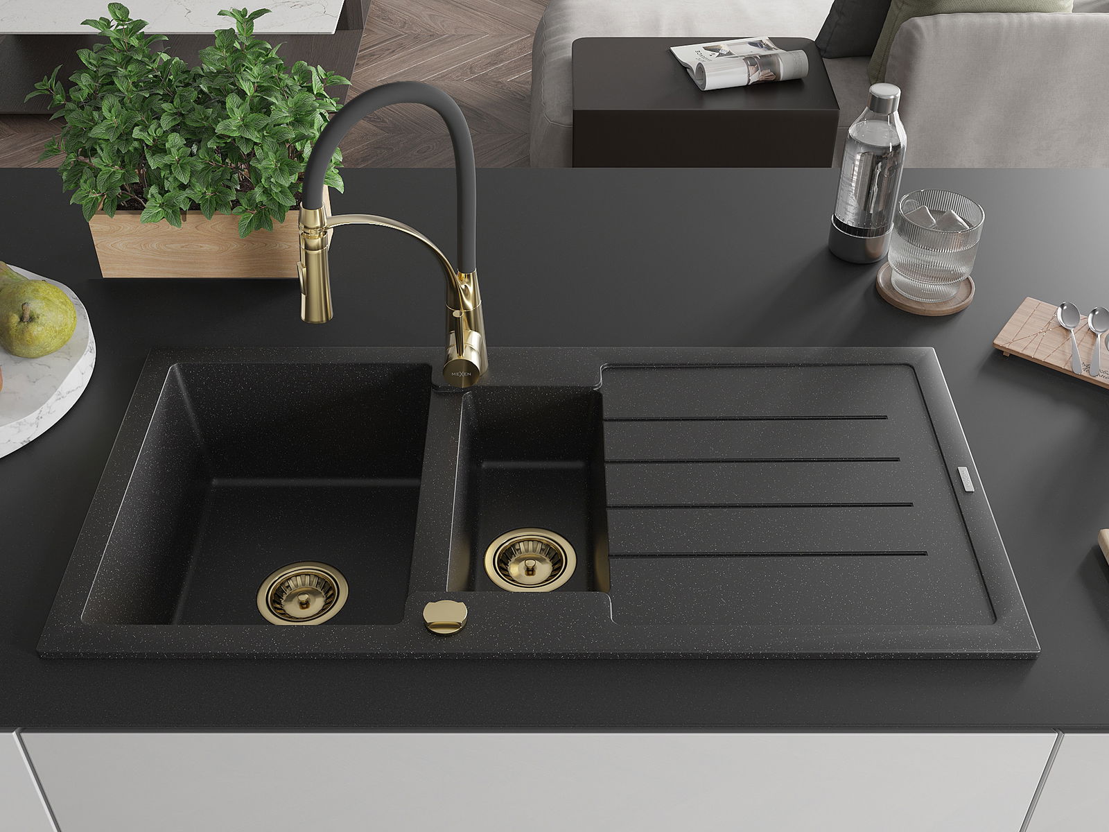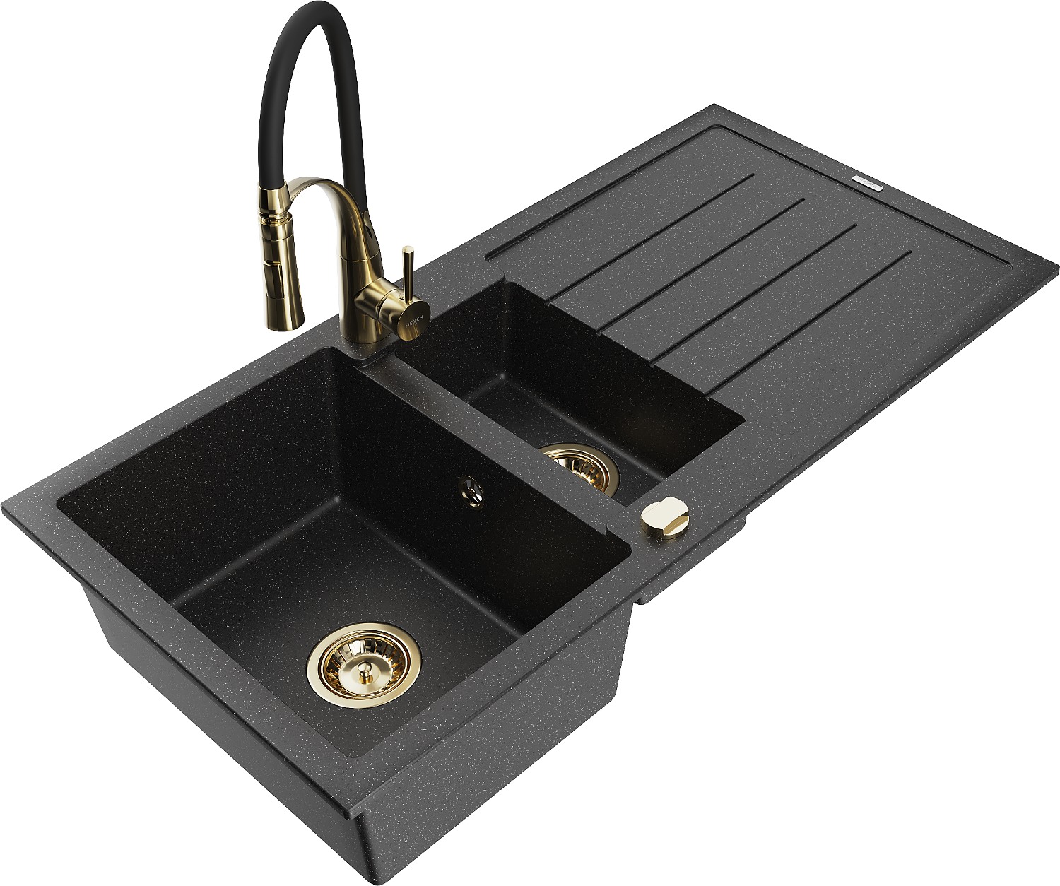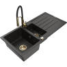 Mexen Andres chiuvetă din granit cu 1,5 compartimente și scurgător și baterie de bucătărie Aster, negru/argintiu