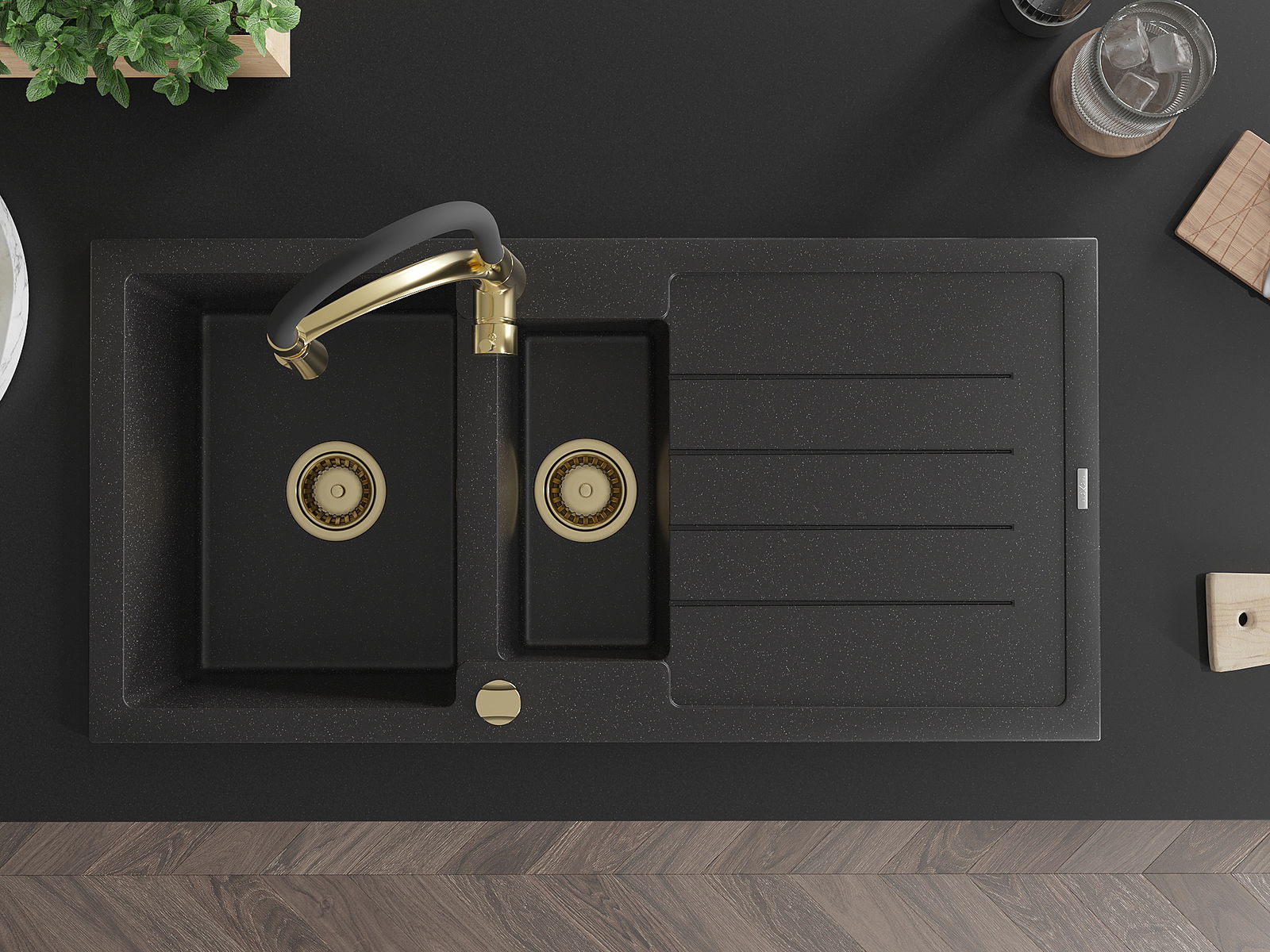 Chiuveta are 2 orificii frezate de 35 mm în diametru, care pot fi perforate manual. Acestea pot fi utilizate, printre altele, pentru instalarea unui dozator de detergent, care va elimina prezența sticlelor de plastic din bucătărie și va oferi un finisaj elegant.