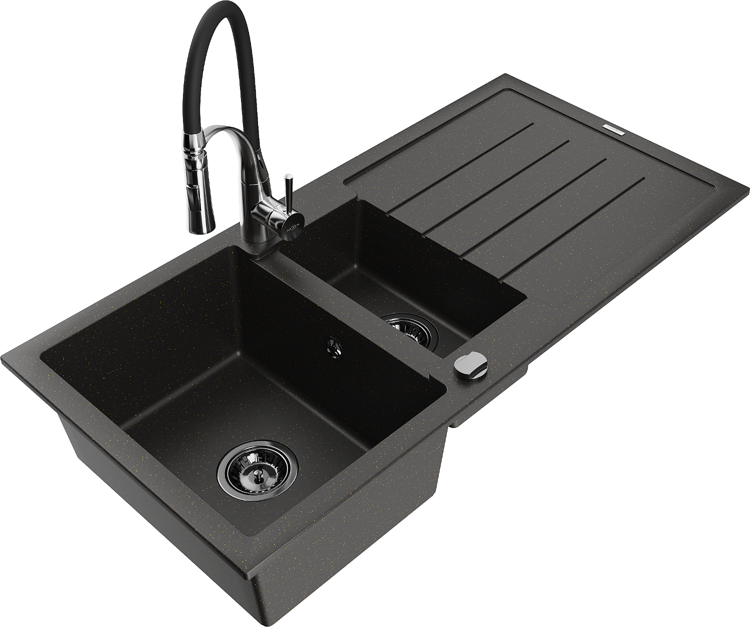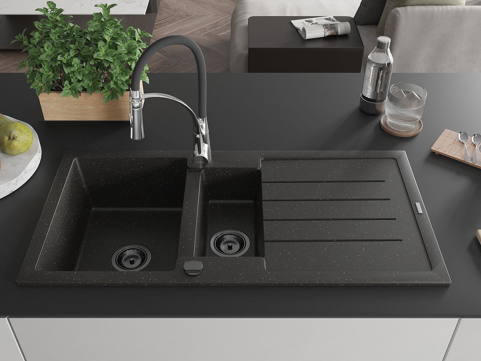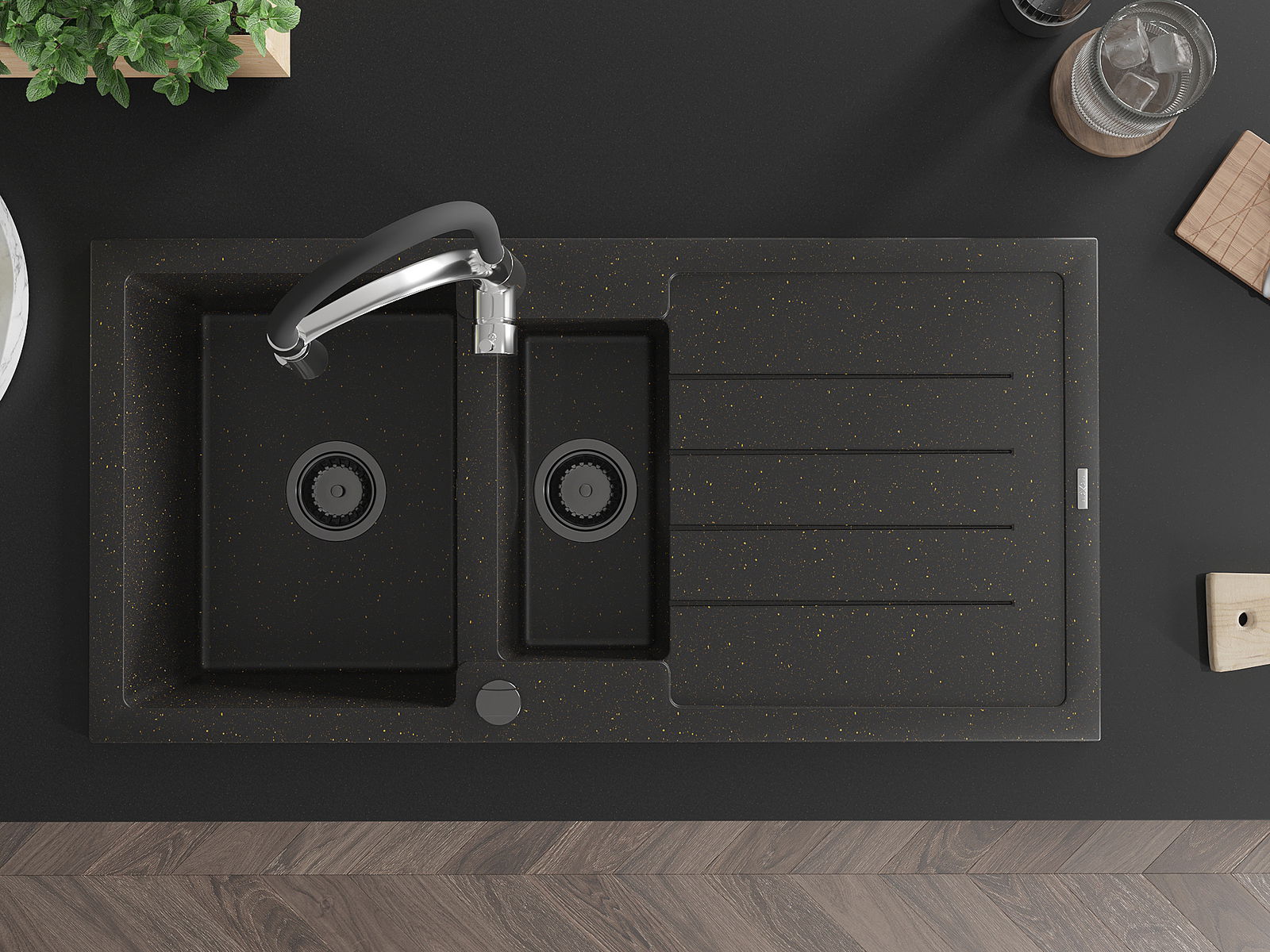 Mexen Andres chiuvetă de granit cu 1,5 camere cu scurgător și baterie de bucătărie Aster, negru/auriu metalic