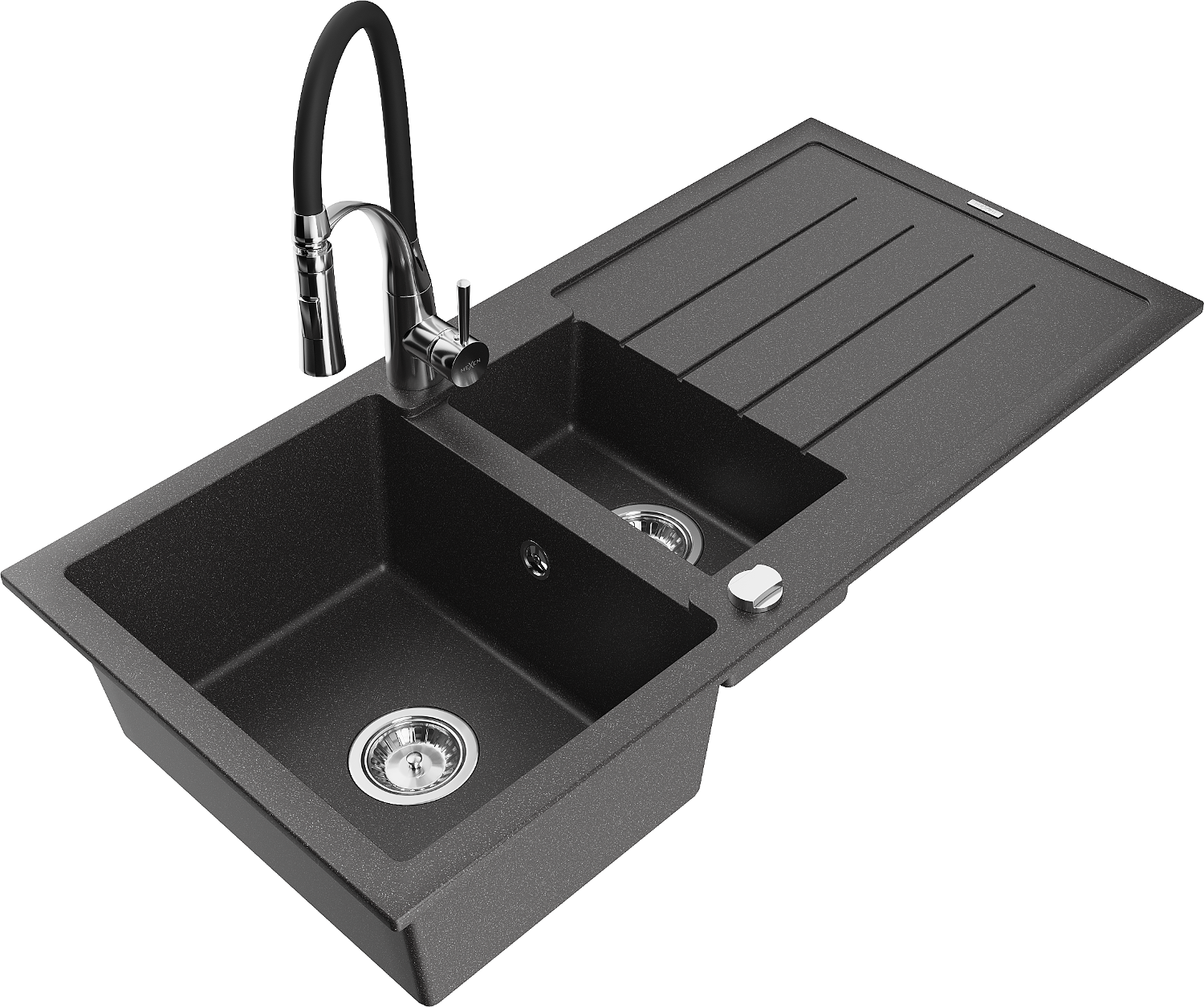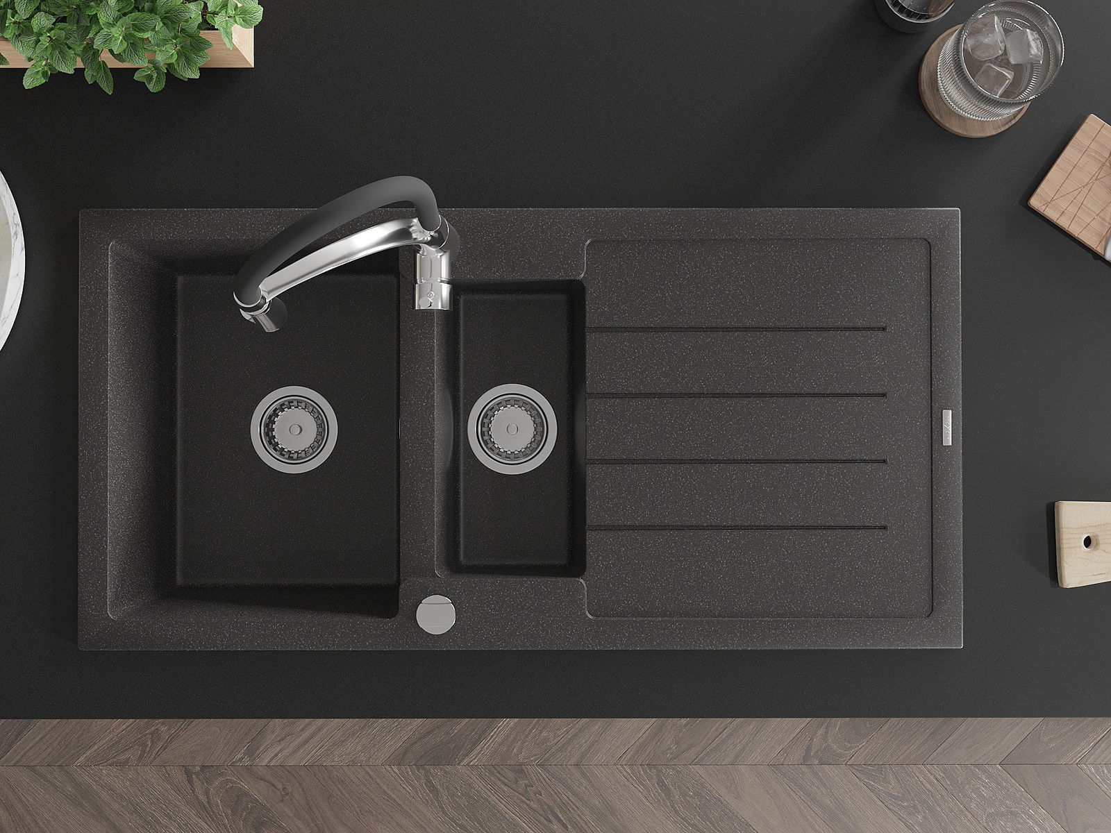 Mexen Andres chiuvetă din granit cu 1,5 compartimente și scurgător și baterie de bucătărie Aster, negru patat
